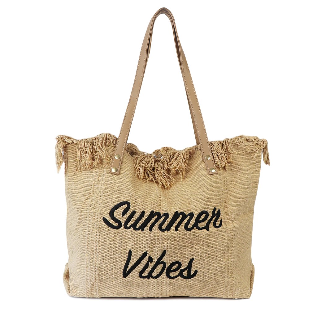 Bavlnená plážová taška T-502-2 s nápisom a strapcami, hnedej farby 7302133