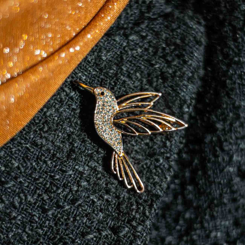 Výrazná brošňa s motívom kolibríka očarí prepracovaným tvarom a trblietavými zirkónmi, ktoré dodávajú šperku živosť a luxusný vzhľad. Jemne tvarované krídla vytvárajú dojem ľahkosti a ladného letu, zatiaľ čo farebné varianty podčiarkujú originalitu celého dizajnu. Brošňa pôsobí elegantne, ale zároveň hravo – skvele doplní kabát, sako aj šaty a stane sa neprehliadnuteľným detailom každého outfitu.