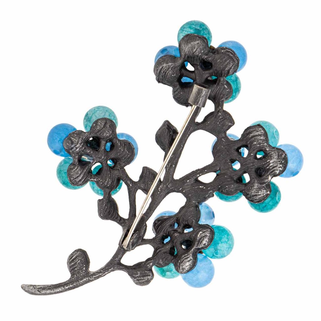 Elegantná brošňa v podobe vetvičky plnej kvetov očarí sýtymi odtieňmi modrej. Kvietky sú tvorené guľatými korálikmi v tyrkysovej a blankytnej farbe, ktorých stred zdobia trblietavé zirkóny. Tmavostrieborný základ brošne podčiarkuje jemný kontrast farieb a dodáva celku nádych vintage romantiky.