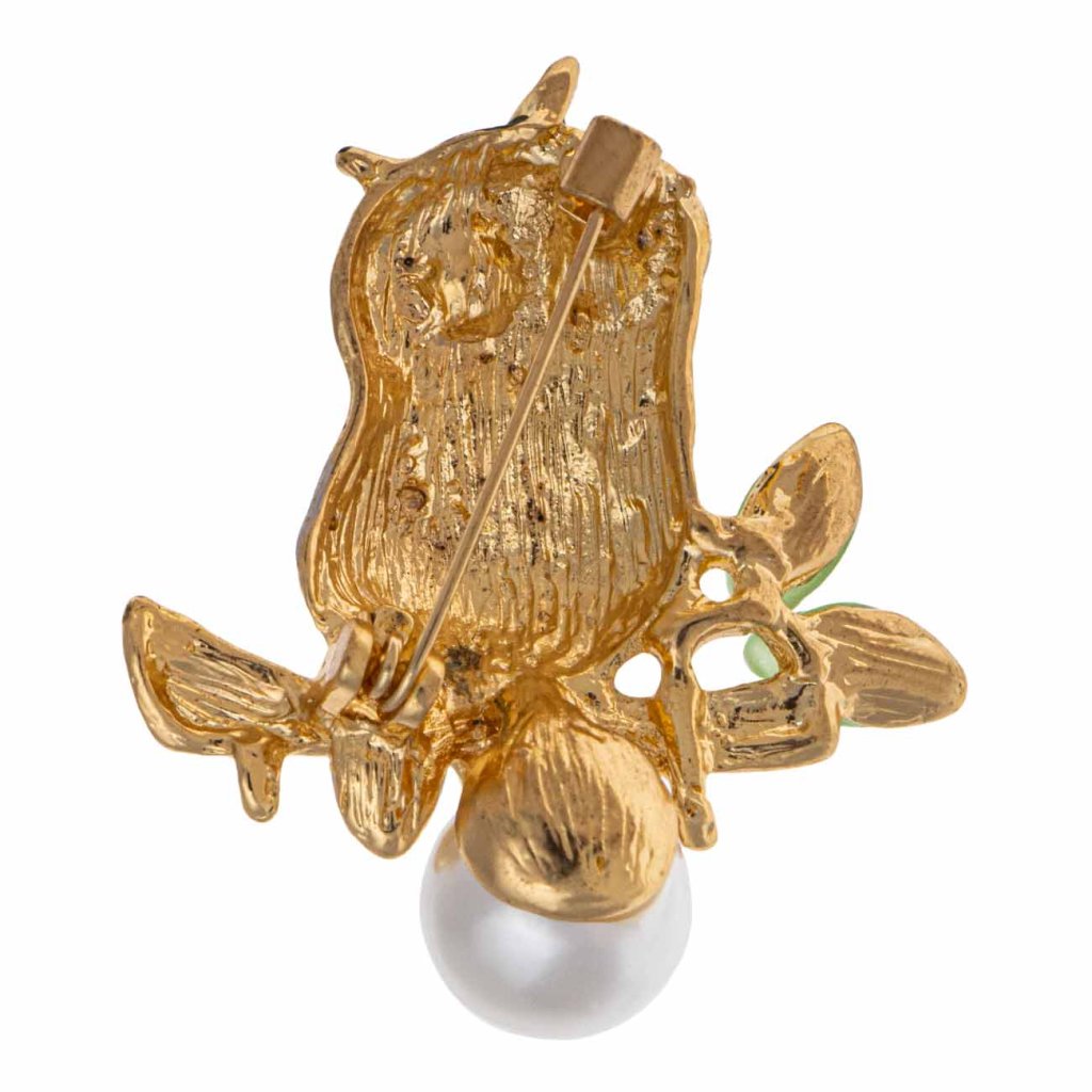 Detailne spracovaná brošňa v tvare sovy sediacej na konári, doplnená smaragdovo zelenými očami, jemnými lístkami a dekoratívnou perlou. Výrazný doplnok pre milovníčky prírody, symbol múdrosti a originality.