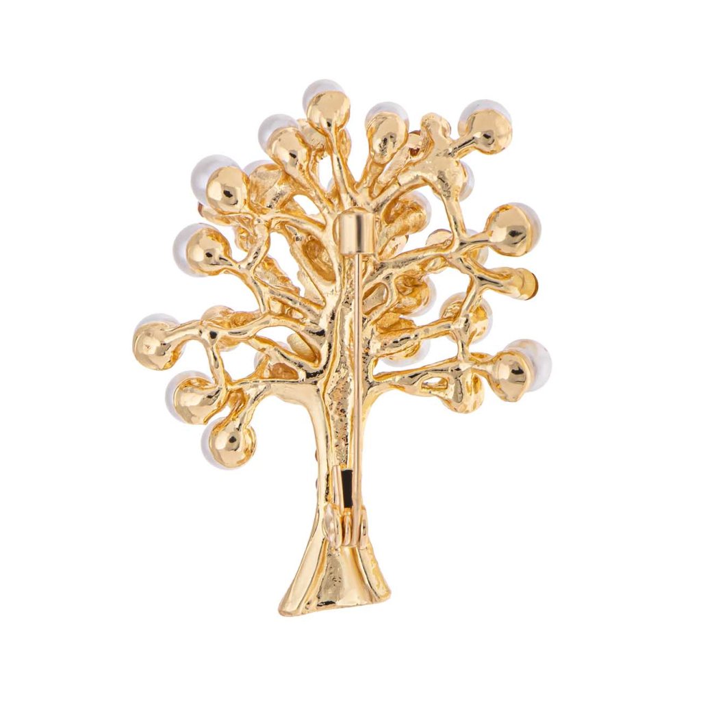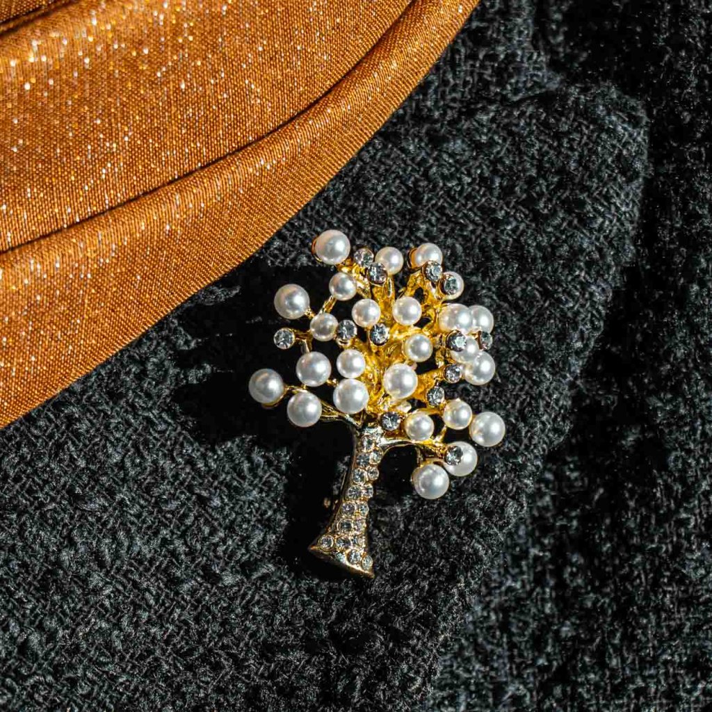 Výrazná broš s motívom stromu života zaujme bohato tvarovanou korunou osadenou perličkami, ktoré pôsobia ľahko a harmonicky. Jemný trblietavý efekt zirkónov v kmeni aj medzi vetvami dodáva šperku luxusný vzhľad a podčiarkuje jeho symboliku sily, rovnováhy a obnovy. Pozlátený bižutérny kov vytvára elegantný kontrast s perleťovým leskom a robí z brošne neprehliadnuteľný doplnok pre kabát, sako aj slávnostnejší odev.