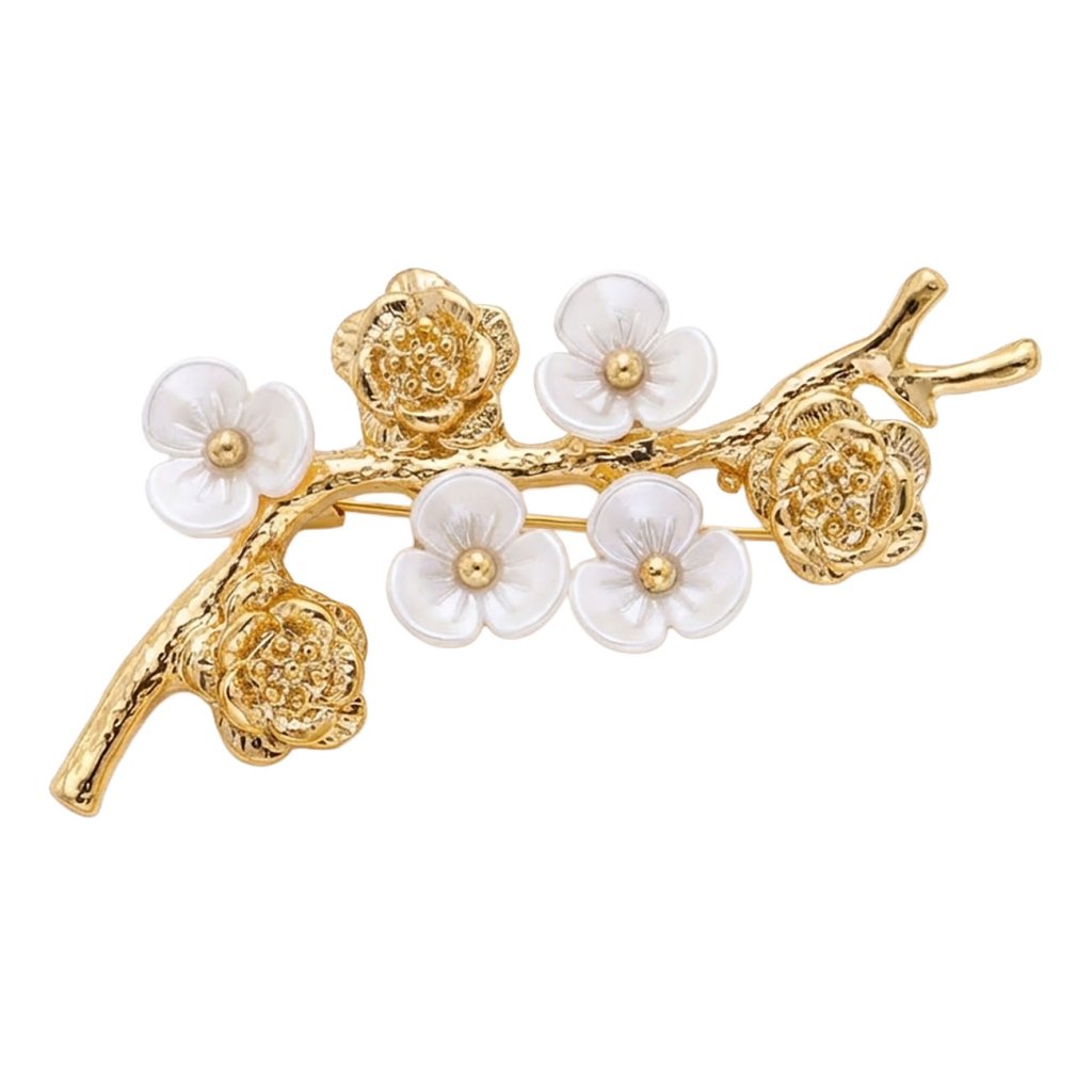 Elegantná brošňa v tvare kvitnúcej vetvičky zaujme harmonickým spojením jemných perleťových kvetov a plasticky spracovaného bižutérneho kovu. Detailne tvarované kvety pôsobia ľahko a vzdušne, zatiaľ čo kovová štruktúra dodáva šperku noblesný charakter. Brosňa sa krásne vyníma na kabáte, saku aj šále a stane sa decentným, avšak výrazným doplnkom pre každodenný aj slávnostnejší komplet.