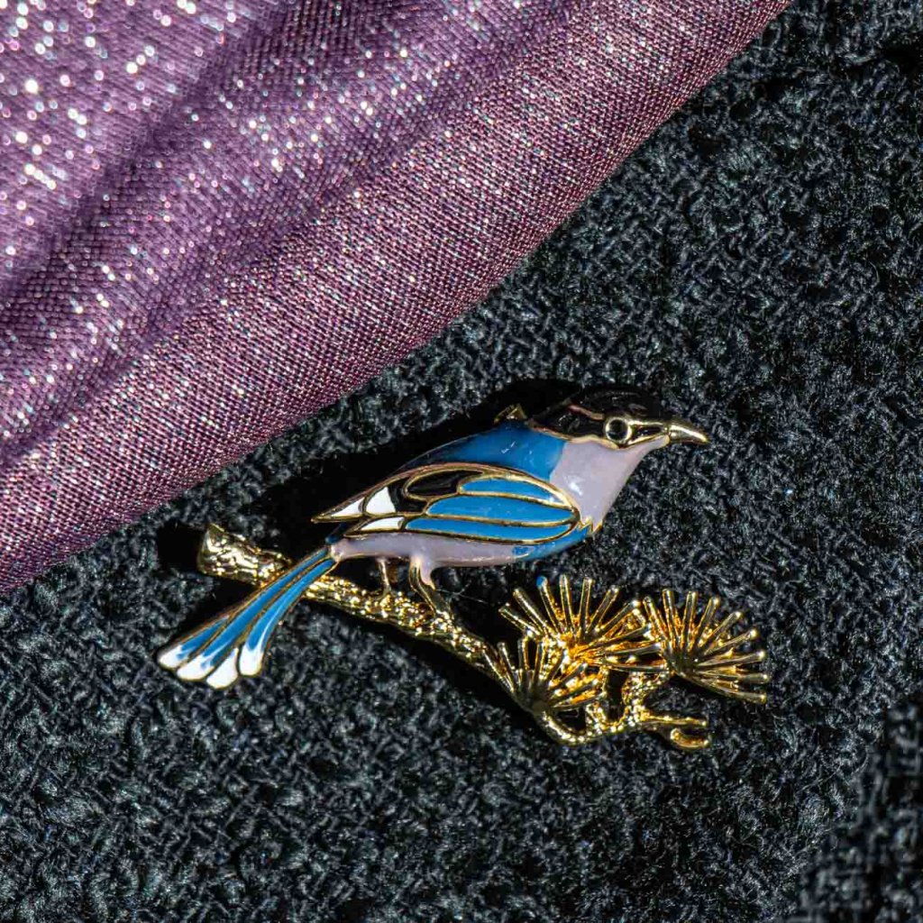 Decentná brošňa s motívom vtáčika sediaceho na štylizovanej vetvičke zaujme prepracovanými líniami a jemným farebným smaltovaním. Kontrastná kombinácia tónov spolu s detailmi z bižutérneho kovu vytvára harmonický a elegantný celok, ktorý pôsobí ľahko, prirodzene a nadčasovo. Ideálny doplnok na kabát, sako či šálu, ktorý dodá outfitu osobitý akcent inšpirovaný prírodou.