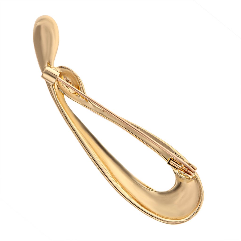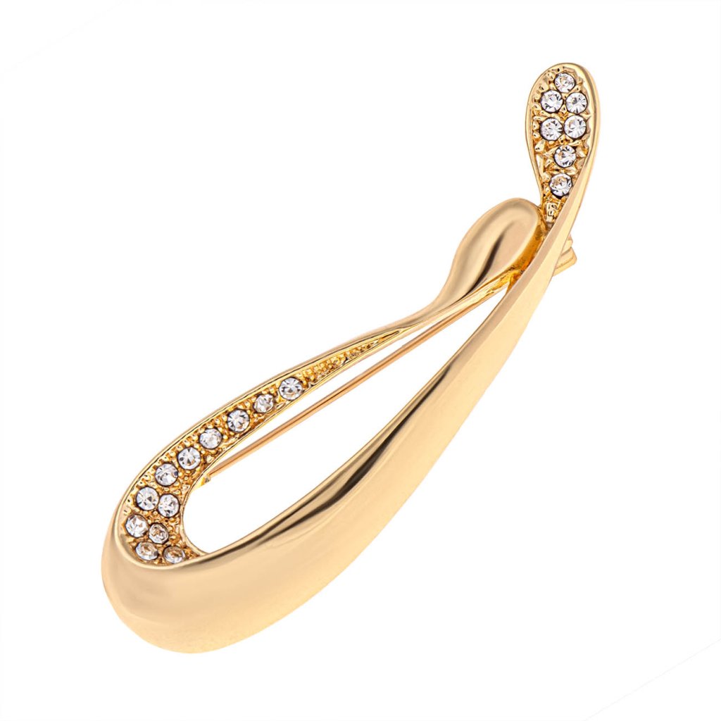 Moderná brošňa v zlatom tóne vyniká svojou elegantnou, pretiahnutou siluetou a jemne trblietavými zirkónmi, zasadenými do lesklého kovu. Zlatá povrchová úprava pôsobí luxusne a slávnostne, pričom tvar brošne evokuje jemný pohyb a plynulosť. Brošňový špendlík na zadnej strane zaisťuje jednoduché a bezpečné pripnutie.