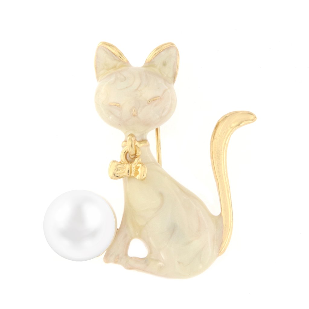 Brošňa – glazúrovaná mačka s umelou perlou, bielej farby.