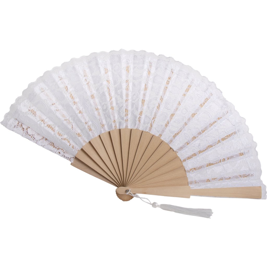 Elegantný čipkovaný vejár vhodný na svadby a špeciálne udalosti. Na rukoväti je ozdobný strapec.