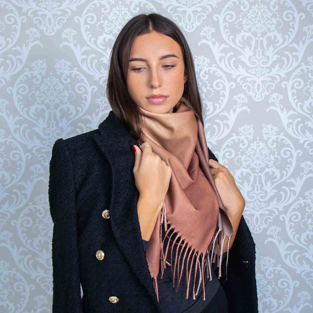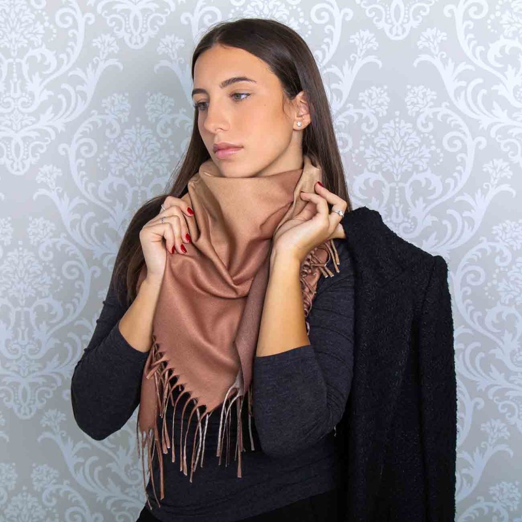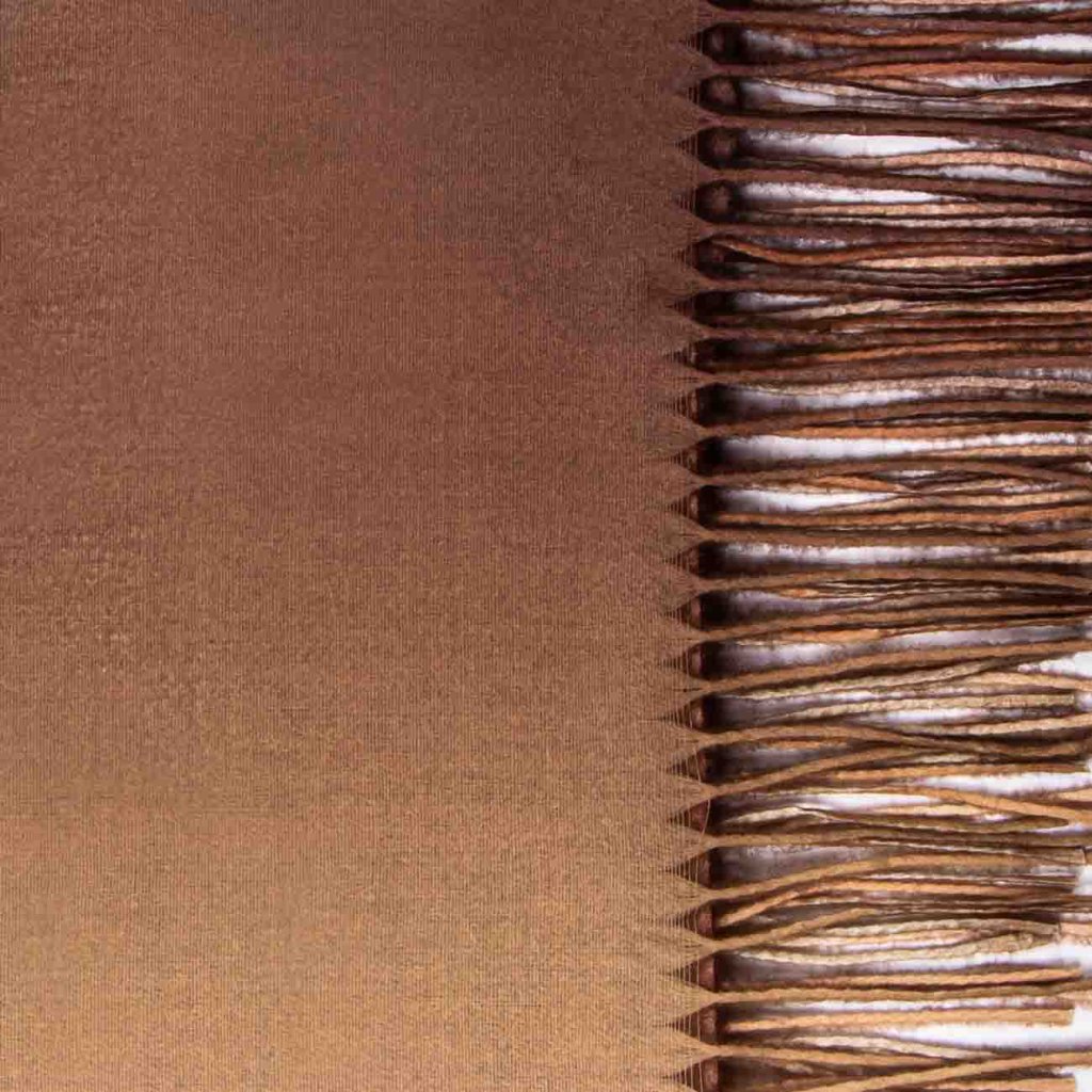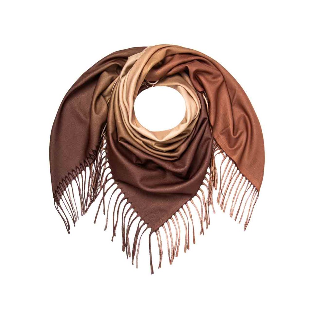 Elegantná štvorcová šatka v luxusnej kombinácii teplých hnedých a béžových tónov. Vďaka jemnému farebnému prechodu pôsobí nadčasovo a ľahko sa kombinuje s rôznymi outfitmi. Strapce na okrajoch dodávajú šatke hravosť, zatiaľ čo materiál z viskózy a kašmíru zaisťuje mäkkosť, hrejivosť a pohodlie pri nosení.