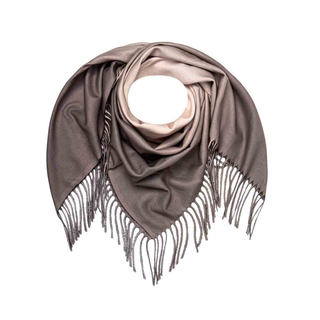 Luxusná dámska šatka s jemným ombré prechodom farieb od krémovej po hnedú, ktorá sa vďaka svojmu štvorcovému tvaru a strapcom stane vaším obľúbeným doplnkom. Spojenie jemnosti kašmíru a príjemnej viskózy zaručuje komfort pri nosení a elegantný vzhľad pre každú príležitosť.