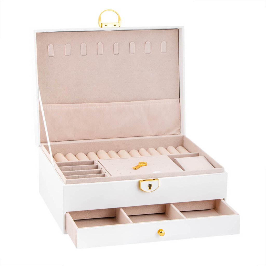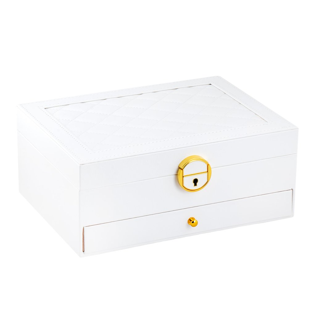 Táto luxusná biela šperkovnica vyniká čistým dizajnom, zlatými kovovými detailmi a prepracovaným vnútorným usporiadaním. Vonkajší plášť je vyrobený z kvalitnej eko kože, ktorá pôsobí elegantne, je odolná a ľahko sa udržuje. Vďaka jemnému prešívanému vzoru na veku a zlatému uzamykaciemu systému získava šperkovnica výnimočný, až prémiový vzhľad.