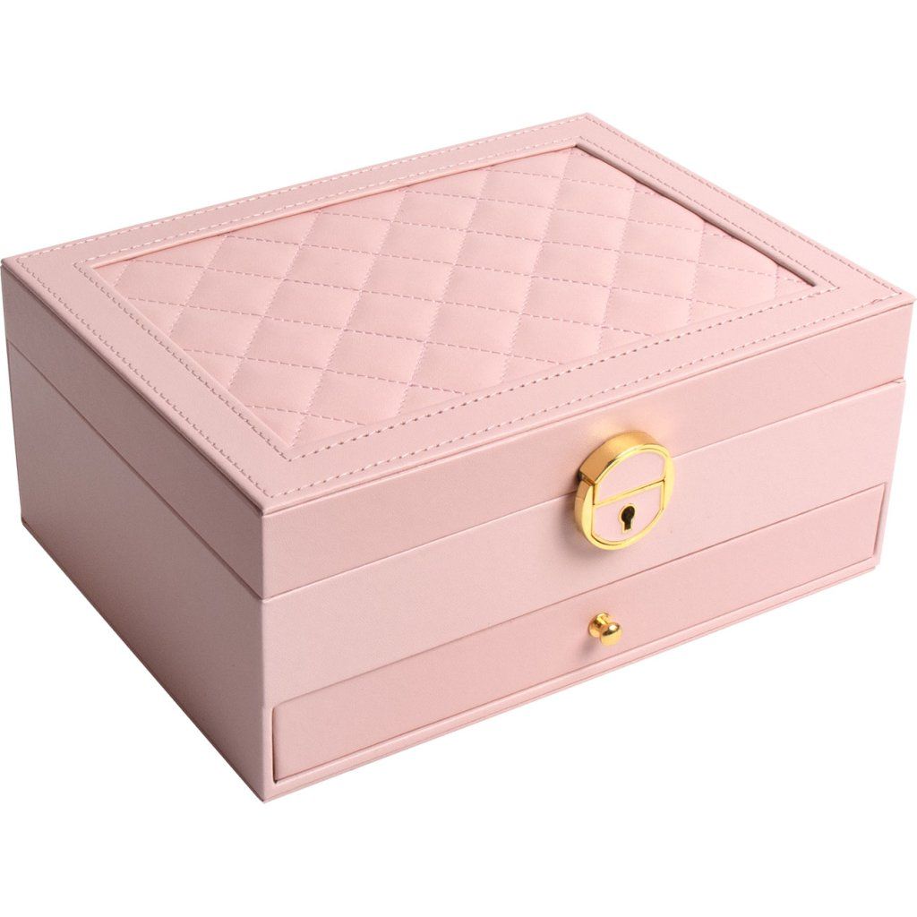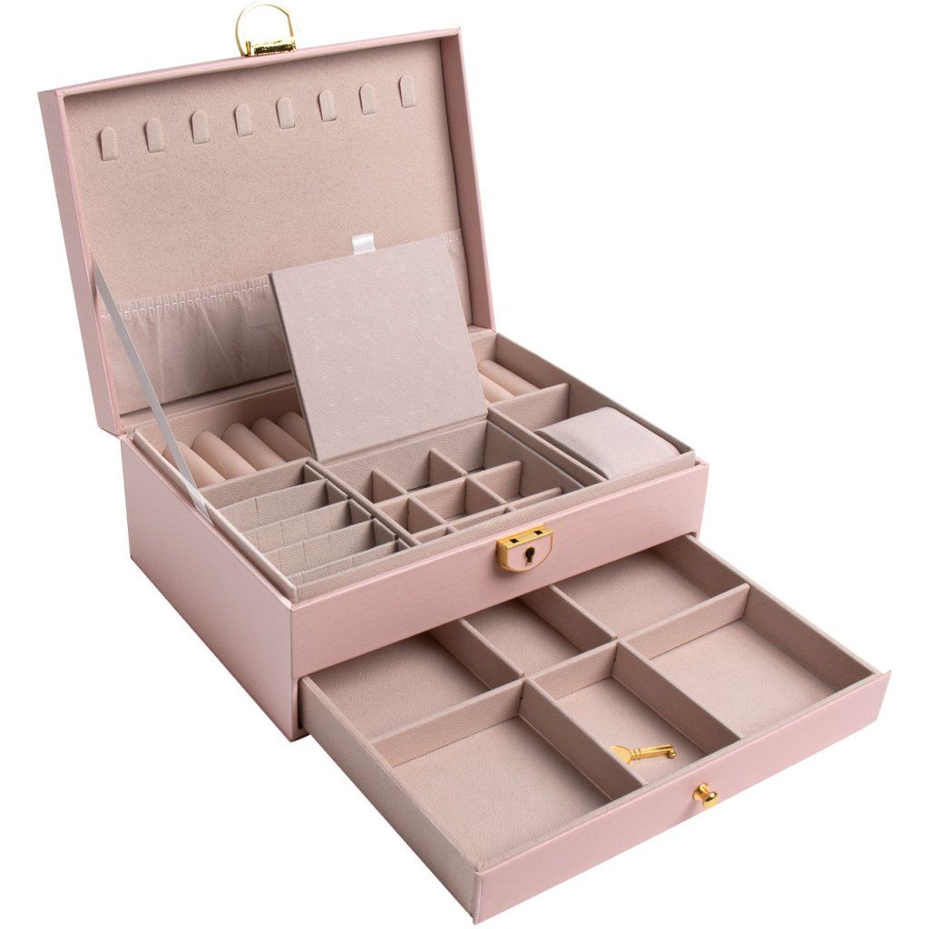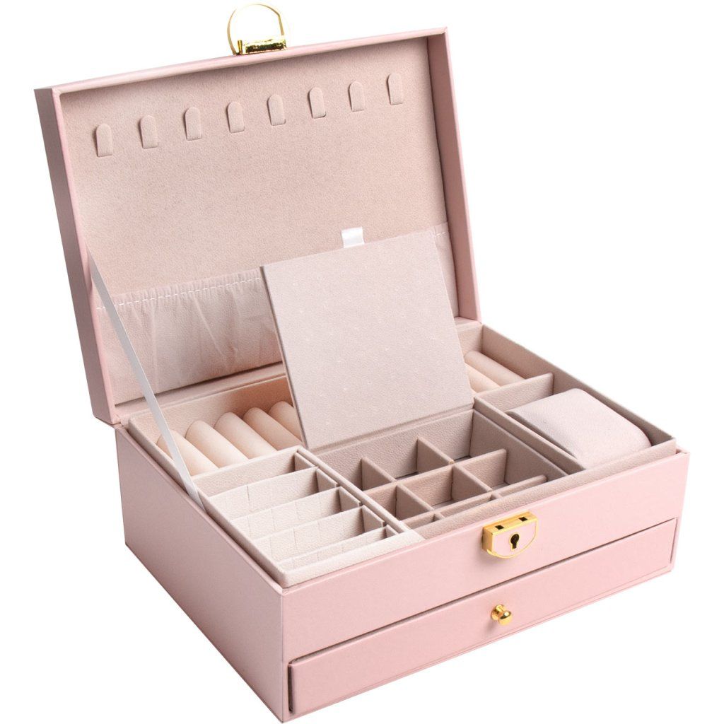 Elegantná a priestranná dámska veľká šperkovnica so zásuvkou 9001798-1 ružová je ideálnym riešením na bezpečné a prehľadné uloženie vašich drahých šperkov. Táto šperkovnica ponúka dostatok priestoru na prstene, retiazky, náramky, brošne a iné doplnky.