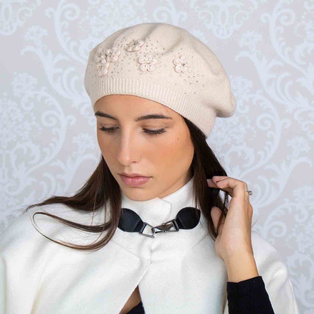 Štýlový pletený baret s jemným kvetinovým zdobením a drobnými štrasovými kamienkami dodá tvojmu outfitu nádych francúzskej elegancie. Mäkký materiál s prímesou angory je príjemný na dotyk a krásne hreje. Baret sa dokonale prispôsobí tvaru hlavy a vďaka decentnému lesku pôsobí luxusne aj pri každodennom nosení.