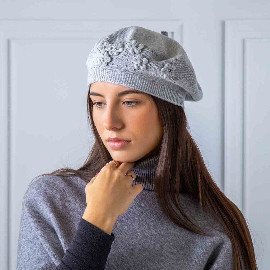 Štýlový pletený baret s jemným kvetinovým zdobením a drobnými štrasovými kamienkami dodá tvojmu outfitu nádych francúzskej elegancie. Mäkký materiál s prímesou angory je príjemný na dotyk a krásne hreje. Baret sa dokonale prispôsobí tvaru hlavy a vďaka decentnému lesku pôsobí luxusne aj pri každodennom nosení.