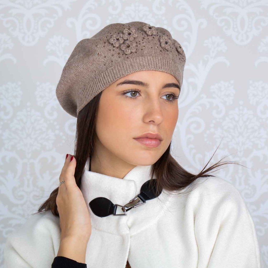 Štýlový pletený baret s jemným kvetinovým zdobením a drobnými štrasovými kamienkami dodá tvojmu outfitu nádych francúzskej elegancie. Mäkký materiál s prímesou angory je príjemný na dotyk a krásne hreje. Baret sa dokonale prispôsobí tvaru hlavy a vďaka decentnému lesku pôsobí luxusne aj pri každodennom nosení.