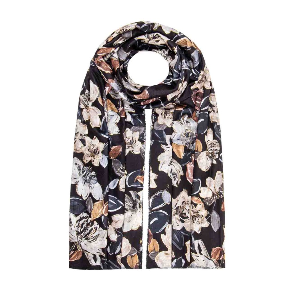 Elegantný a univerzálny šál v čiernom podklade s kontrastnými kvetmi a zlatou potlačou. Skvele sa kombinuje s akoukoľvek farbou oblečenia a pôsobí luxusným dojmom.