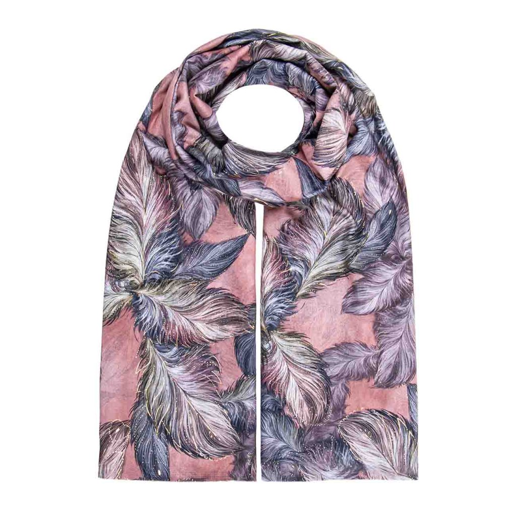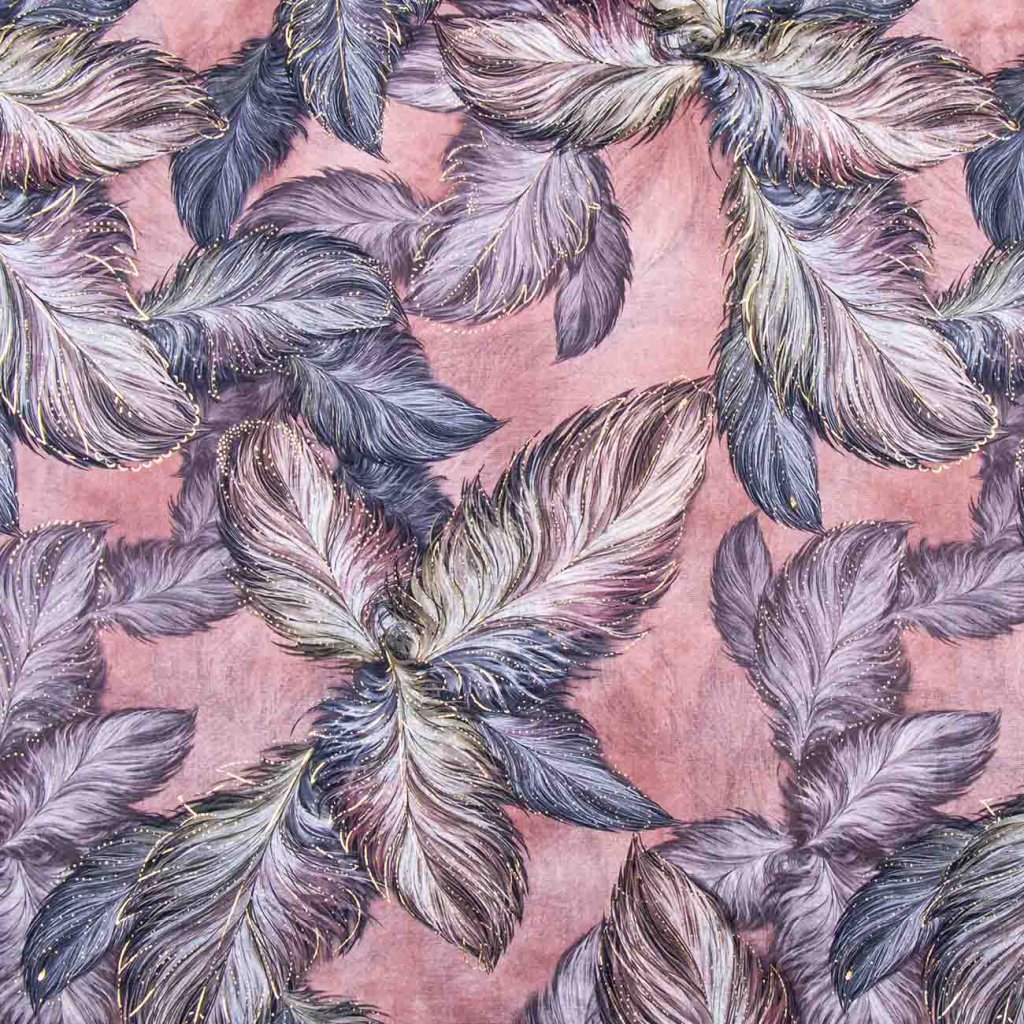 Romantická šatka v ružovom tóne s ľahkým trblietavým efektom vďaka zlatému potlači. Jemný vzor pierok krásne podčiarkne ženskosť.