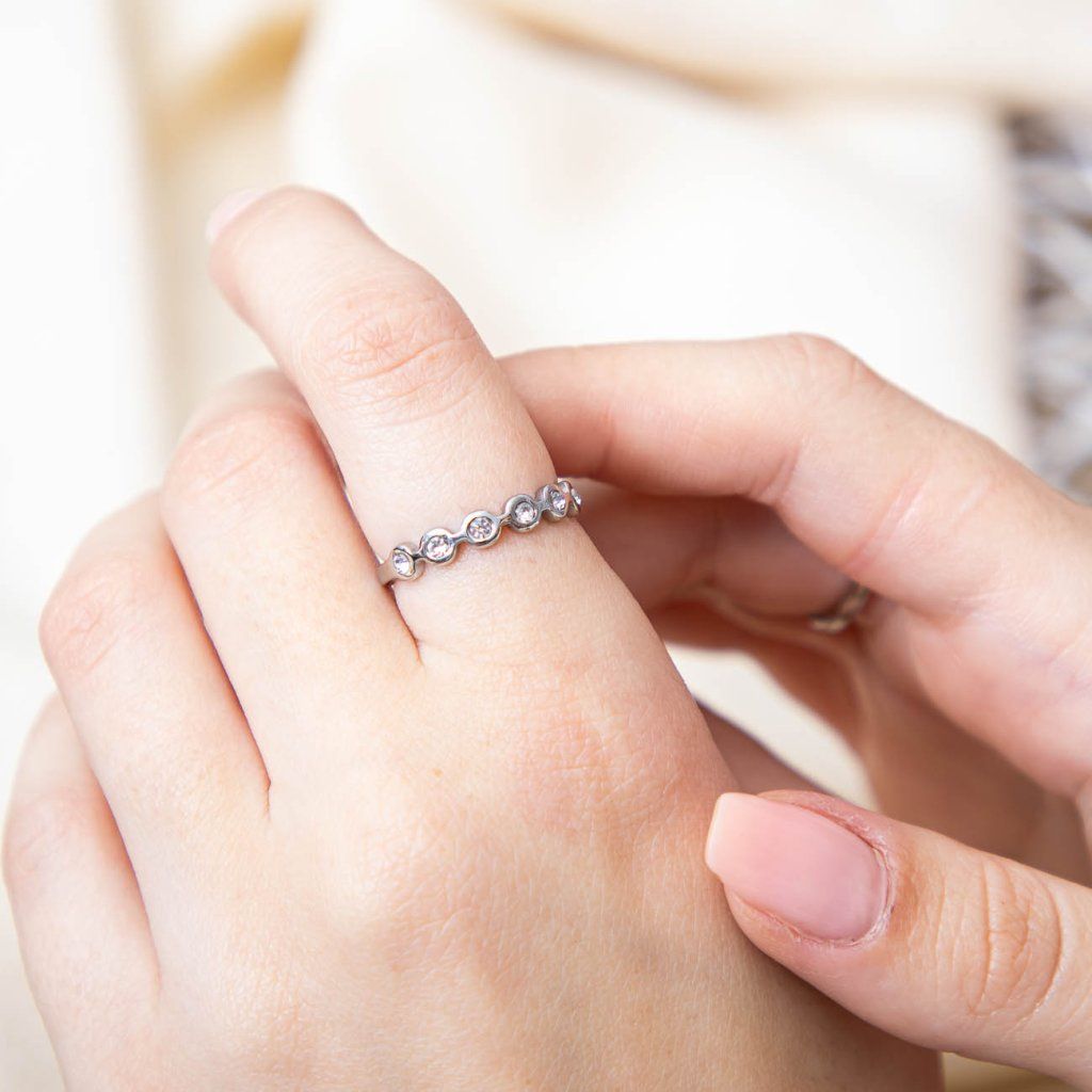 Jemný prsteň z chirurgickej ocele so zirkónmi s priemerom 0,3 cm. Nadčasový, žiarivý doplnok pre každodenné nosenie.