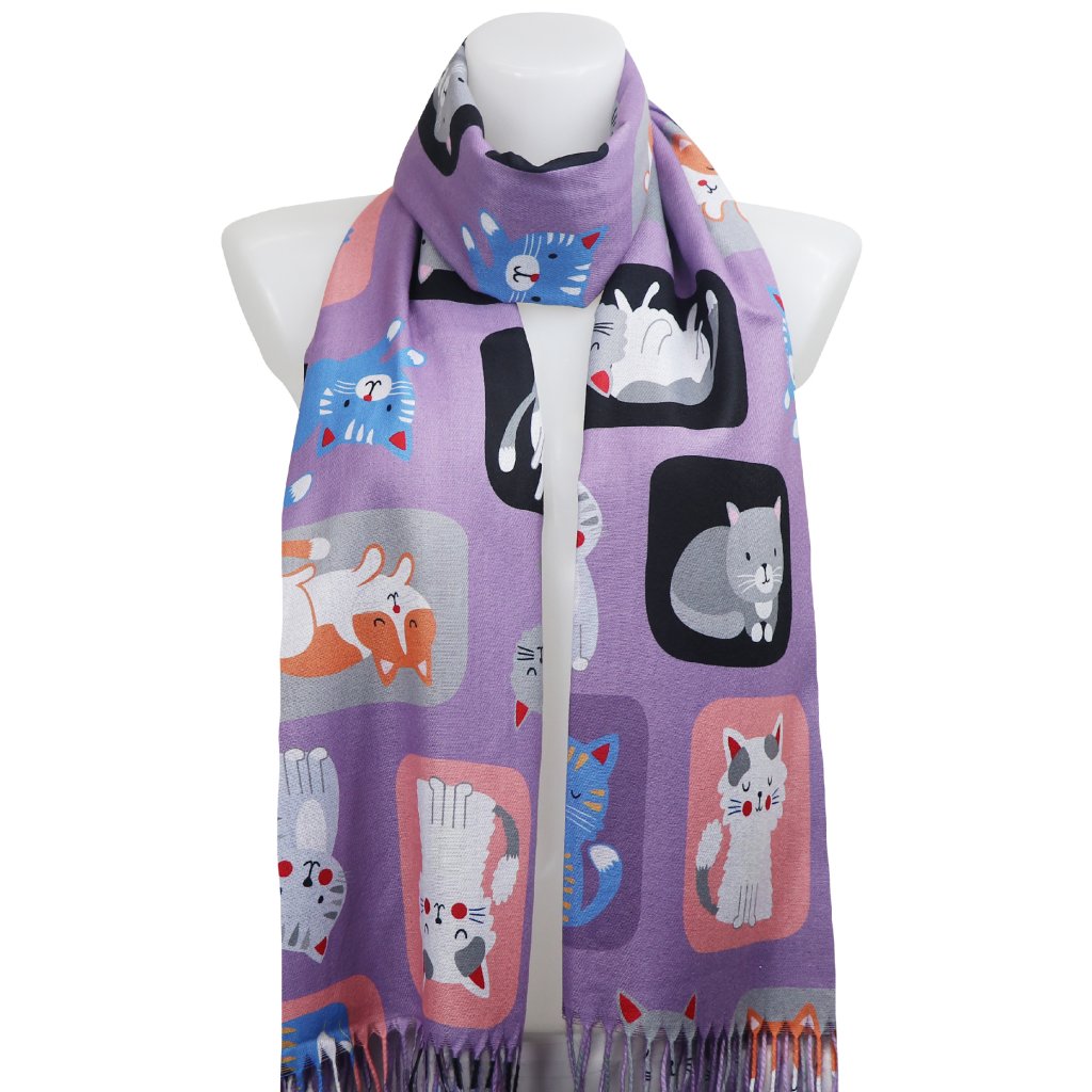 Dámsky kašmírový obdĺžnikový šál 2110-15 kreslené mačičky, fialovej farby 7200584-6