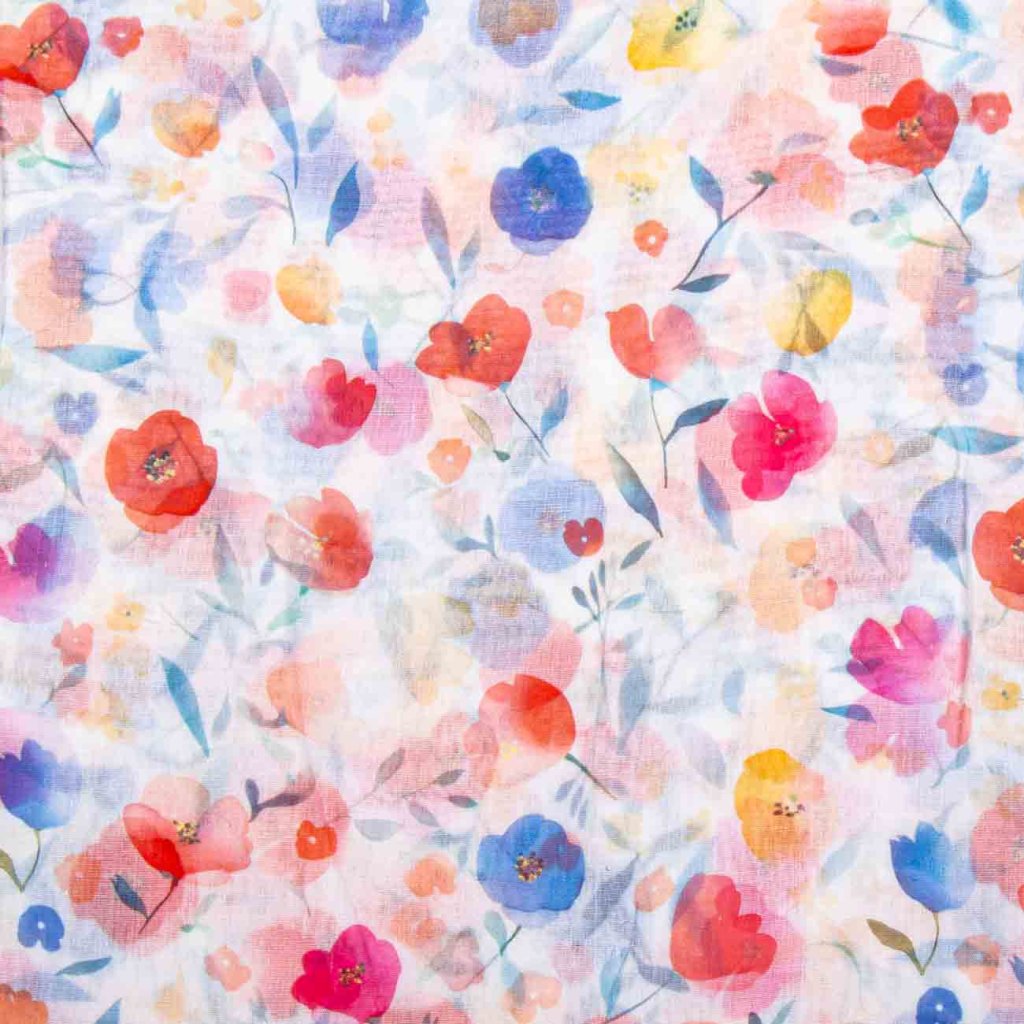 Ľahký a elegantný šál zdobený jemným kvetinovým motívom v akvarelovom veľmi sviežo a romanticky. Pastelové farebné odtiene dodávajú šál nežný vzhľad, ktorý krásne doplní {1 letné outfit. Vďaka kombinácii hodvábu a viskózy je materiál príjemne jemný, ľahký splývavý.