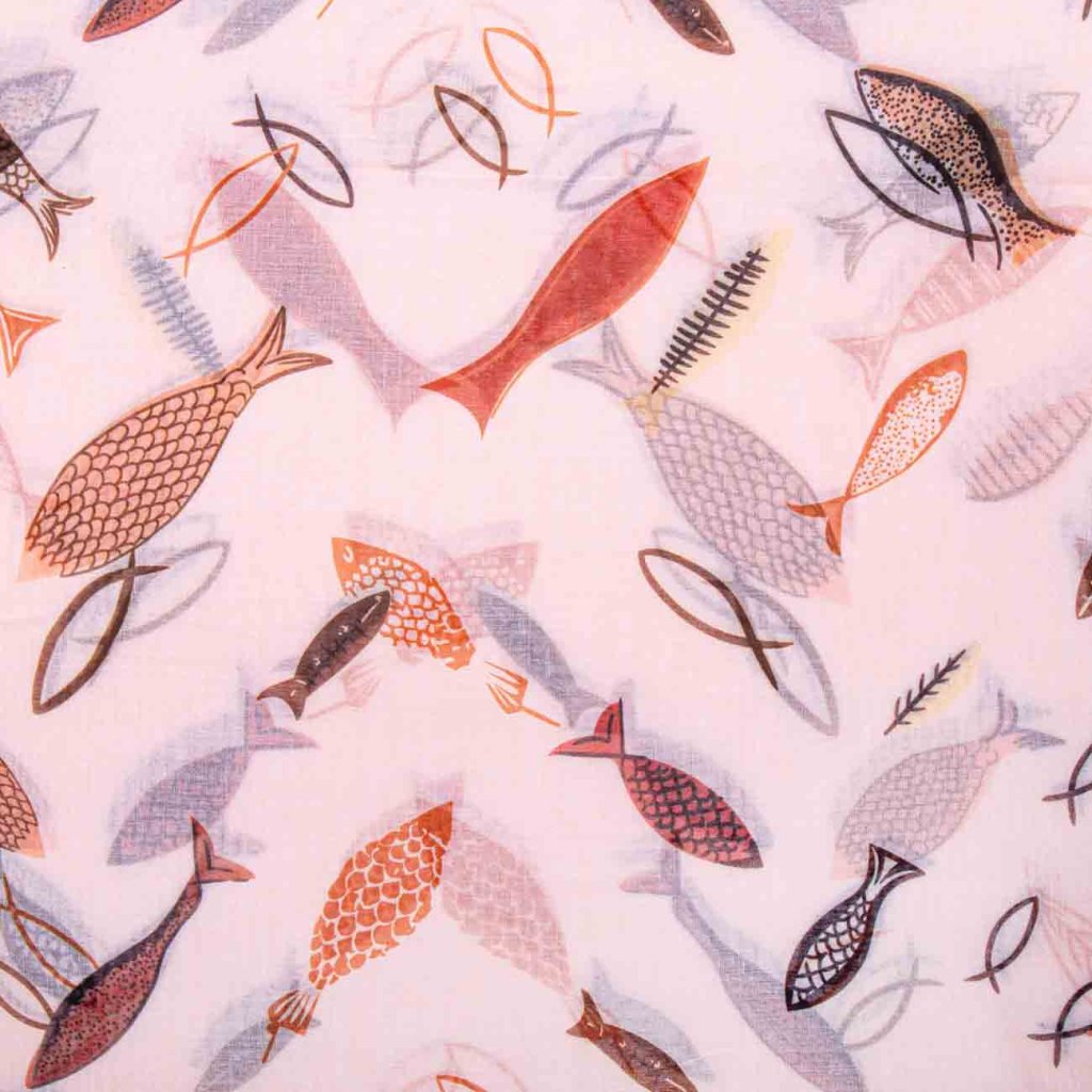 Ľahká a hravá šatka s jemným motívom štylizovaných rybiek pôsobí sviežo a originálne. Farebné detaily vytvárajú zaujímavý kontrast na svetlom podklade a dodávajú šatke moderný a zároveň elegantný vzhľad. Vďaka príjemnému materiálu s prímesou hodvábu je šatka jemná na dotyk, ľahká a krásne splýva pri nosení.