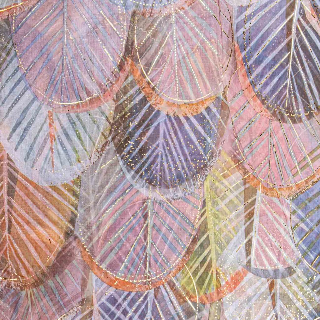 Ľahká a štýlová šatka s jemným listovým vzorom, ktorý je doplnený elegantnými zlatými akcentami. Moderná kombinácia farieb dodáva šatke svieži a sofistikovaný vzhľad, vďaka ktorému ľahko oživí ako jednoduchý outfit, tak aj elegantný kabát či sako. Príjemný materiál s prímesou hodvábu je mäkký, vzdušný a krásne splýva pri nosení.