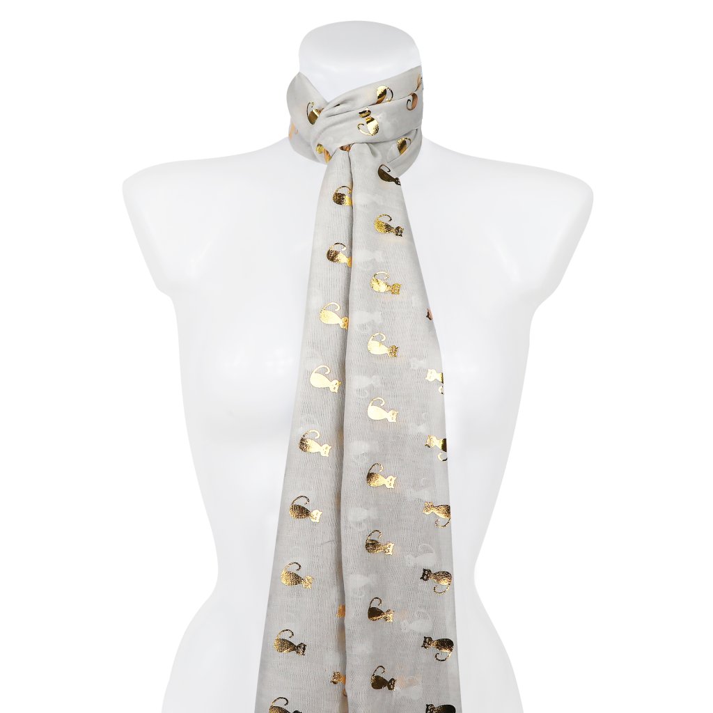 Dámsky ľahký obdĺžnikový šál 345-1 so zlatou potlačou mačiek, šedej farby 7200627-8