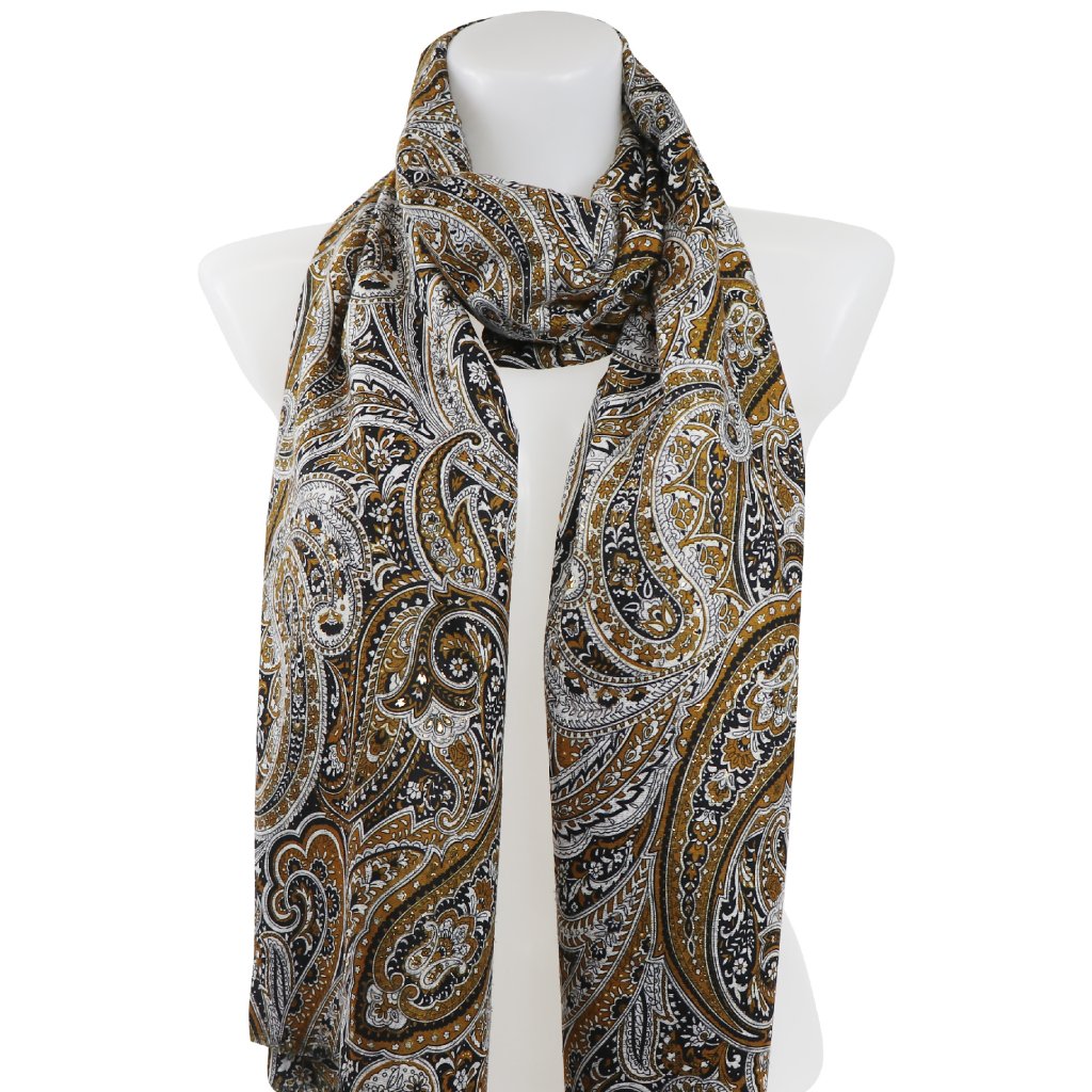 Dámsky obdĺžnikový šál, zdobený vzorom so zlatou nitkou, žltej farby 7200556E