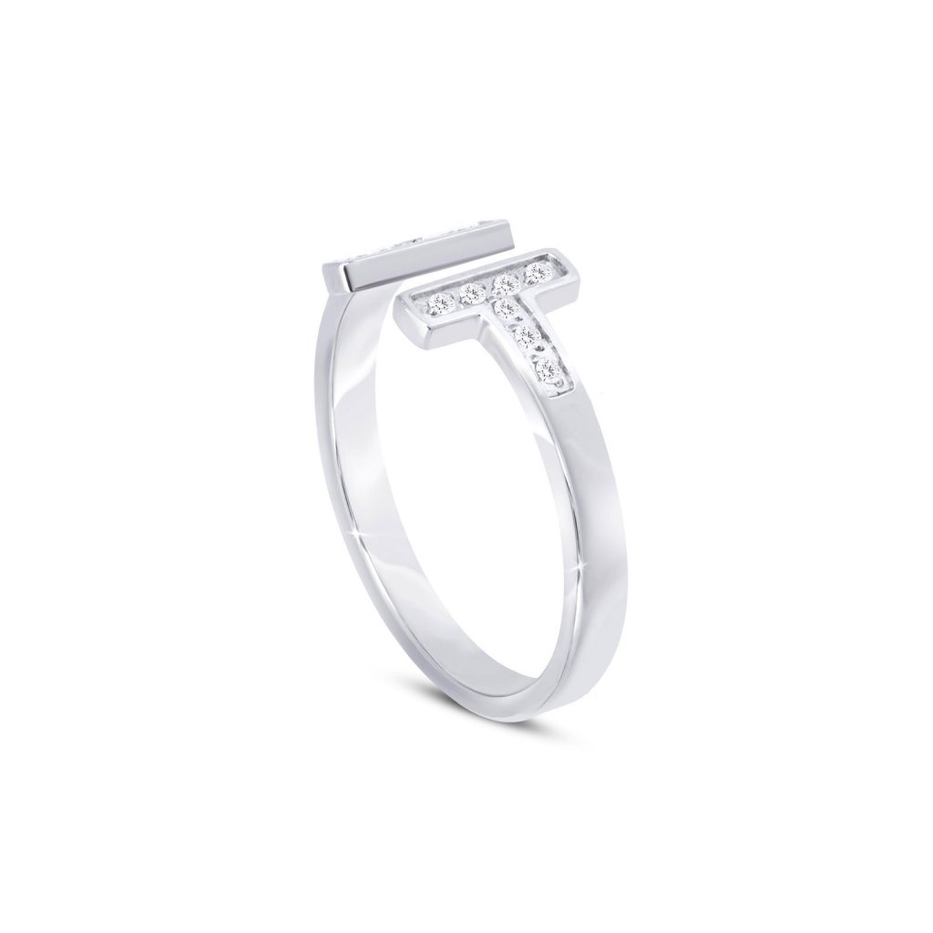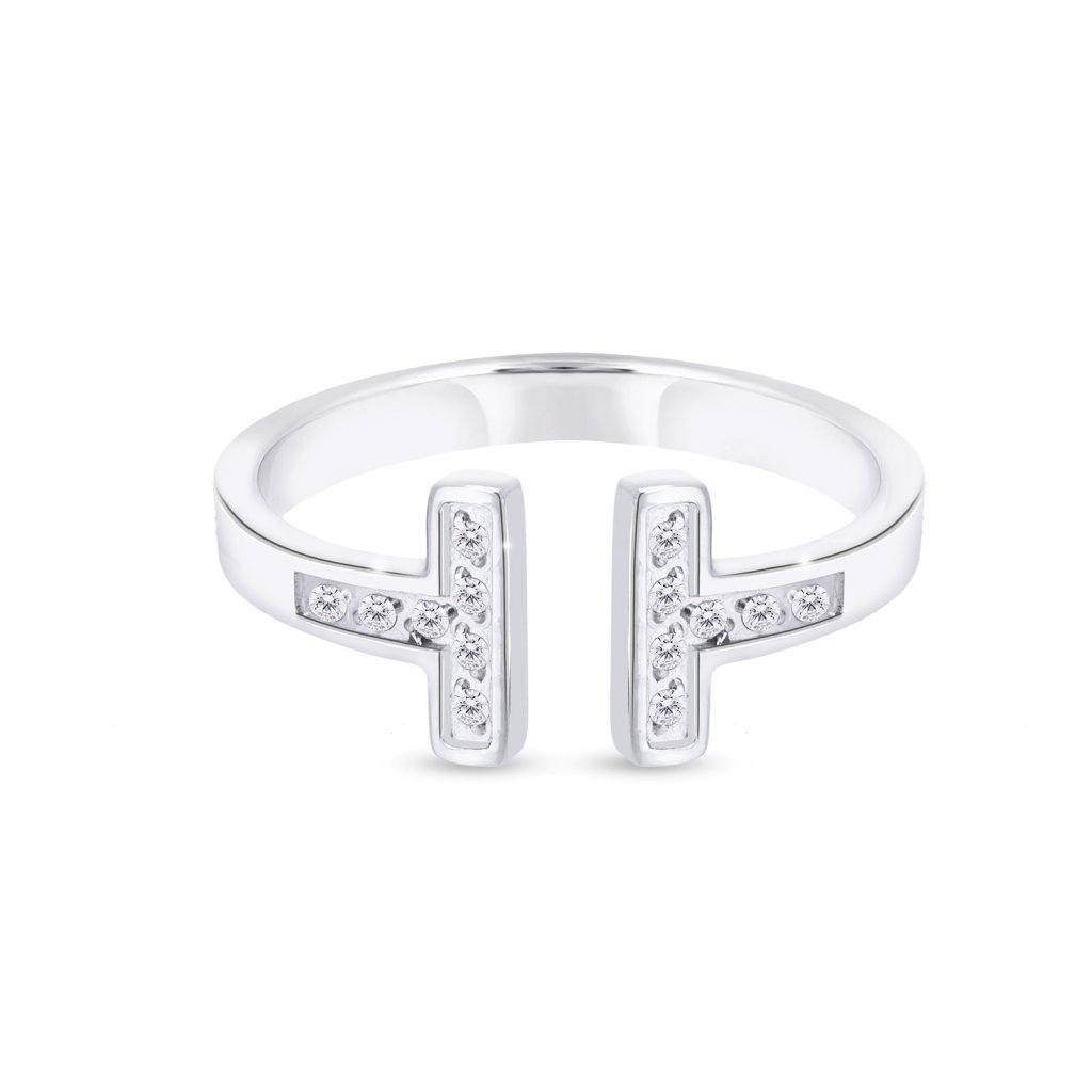 - Dámsky otvorený prsteň z chirurgickej ocele, T so zirkónmi.