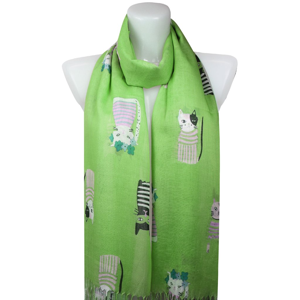 Dámsky tenký obdĺžnikový šál 378-4, mačacie postavičky - zelené farby 7200610-6