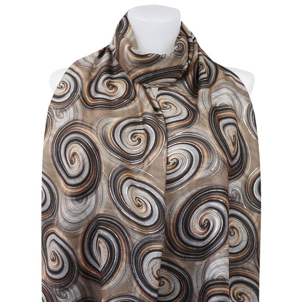 Dámsky teplý obdĺžnikový šál 3015-29 abstraktné kruhy so zlatou nitkou, hnedej farby 7200686-6