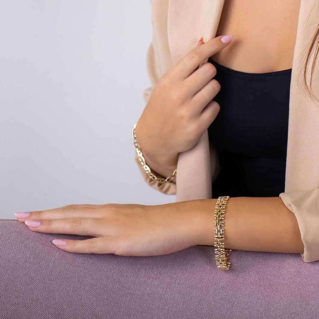 Dizajnovo výrazný náramok so zlatým leskom zaujme svojím rafinovaným spracovaním a originálnou štruktúrou článkov. Geometrické línie doplnené jemnými kamienkami vytvárajú luxusný vzhľad, ktorý podčiarkne váš štýl a dodá každému outfitu výnimočný detail.