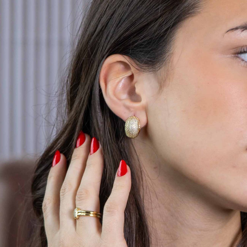 Elegantné náušnice s oblým tvarom zaujmú hustým osadením drobných zirkónov, ktoré vytvárajú intenzívny trblietavý efekt a exkluzívny vzhľad. Precízne spracovanie a plný objem dodávajú šperku výrazný charakter, zatiaľ čo pozlátenie 14K zlatom podčiarkuje jeho luxusné prevedenie. Vďaka klapkovému (ruskému) zapínaniu sa náušnice pohodlne nosia a bezpečne držia na uchu. Ideálna voľba pre slávnostné príležitosti aj výrazný elegantný styling.