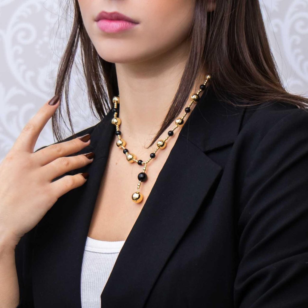 Elegantná pozlátená retiazka s kontrastnou kombináciou čiernych a zlatých korálok vytvára výrazný, ale harmonický šperk.