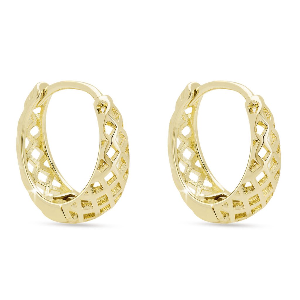 Štýlové náušnice v tvare polkruhu s bohato prerezávaným geometrickým vzorom, ktoré očaria svojou ľahkosťou a jedinečným leskom. Vyrobené z rhodiovaného kovu a pozlátené 14-karátovým zlatom, pôsobia luxusným a zároveň vzdušným dojmom.