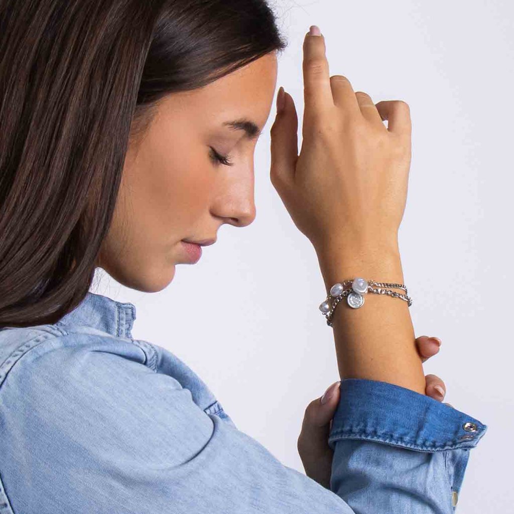Náramok z chirurgickej ocele s medailónom a umelými perlami.