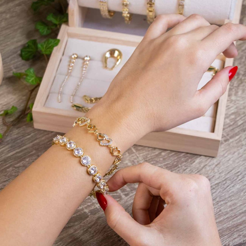 Elegantný náramok pozlátený 14K zlatom zdobený výraznými článkami a trblietavými zirkónmi pôsobí luxusne a moderne.