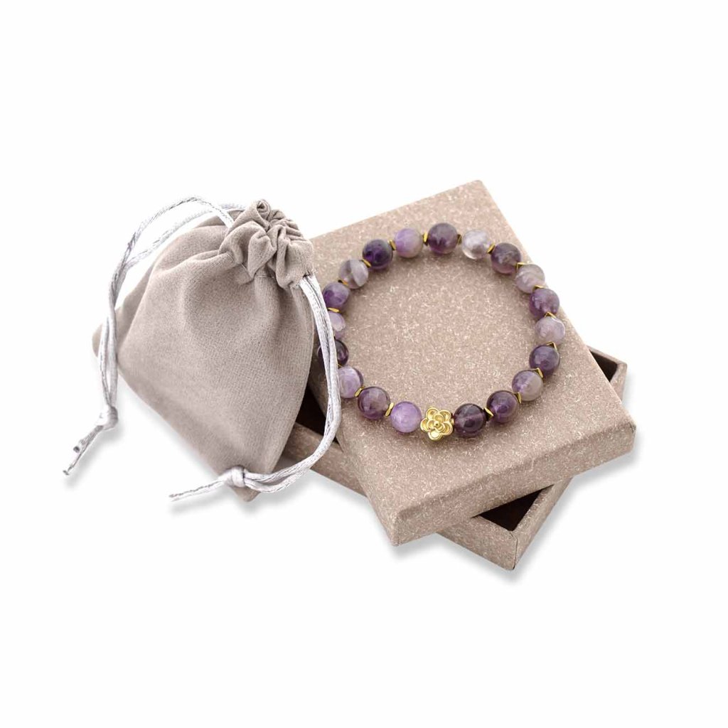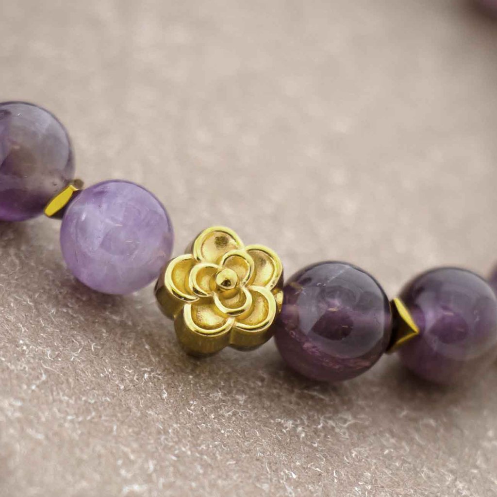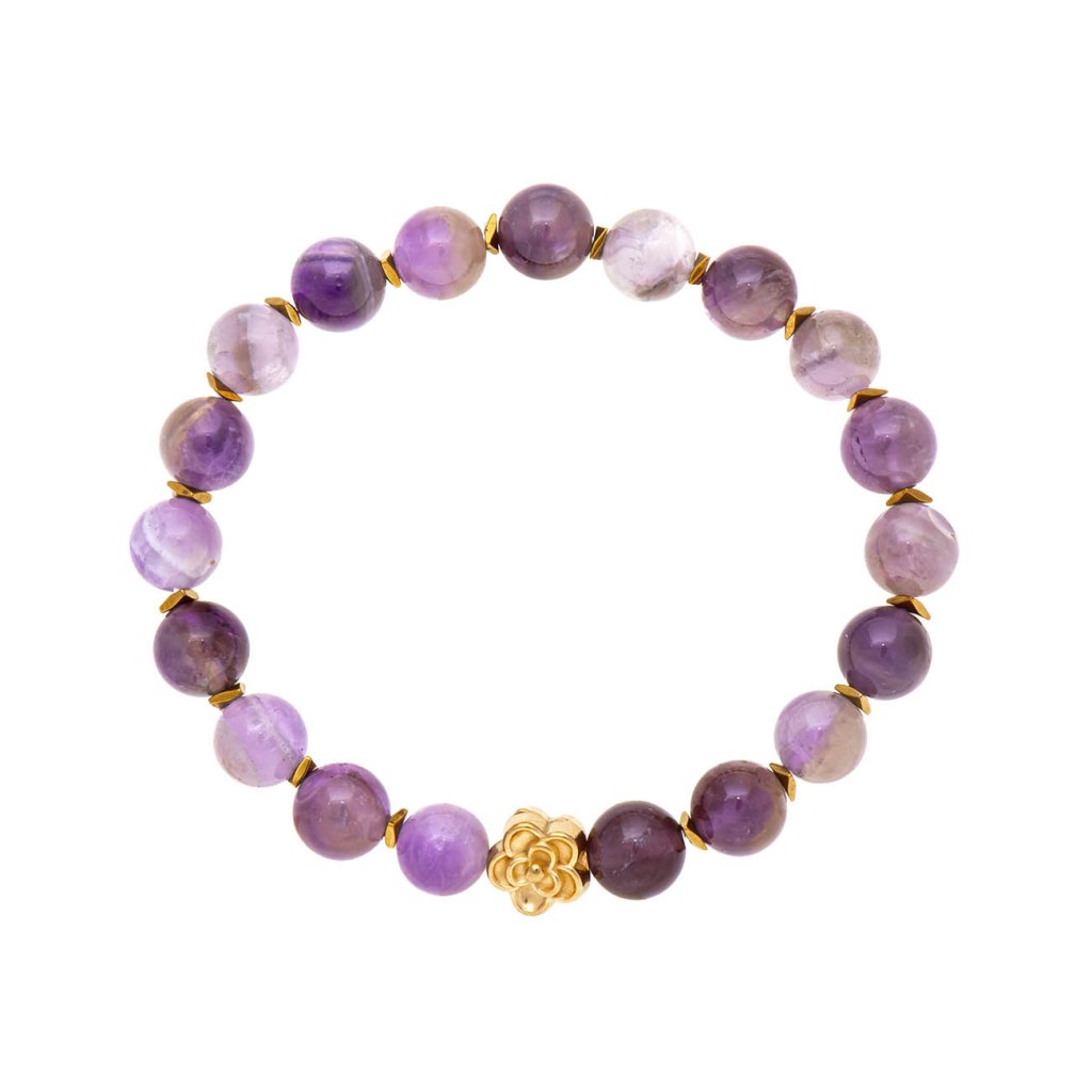 Štýlový náramok vyrobený z jemne fialových korálikov ametystu, ktorý dodáva šperku nádych luxusu, pokoja a harmónie. Stred zdobí pozlátený komponent z chirurgickej ocele v tvare kvetu a drobné komponenty v zlatej farbe striedajúce sa s korálkami, ktoré šperk povyšujú na elegantný doplnok. Vďaka pružnej gumičke sa náramok ľahko prispôsobí zápästiu a je pohodlný na každodenné nosenie.