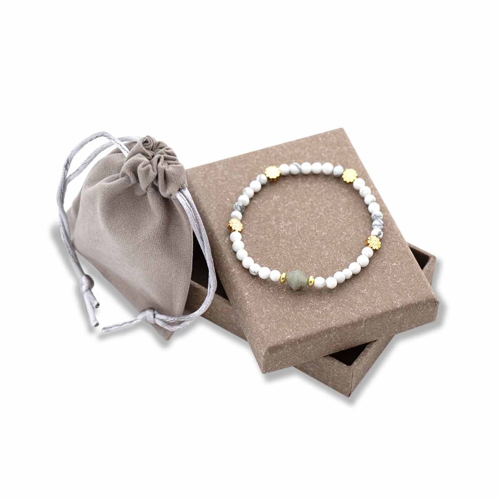 Štýlový náramok vyrobený z drobných korálikov howlitu, ktorý svojím jemným bielym odtieňom so sivým žilkovaním pôsobí čisto a elegantne. Stred tvorí nepravidelne brúsený kameň v náhodných farbách od svetlej po tmavšiu v kombinácii s kovovými komponentmi z chirurgickej ocele v zlatej farbe. Vďaka pružnej gumičke sa náramok ľahko prispôsobí zápästiu a je pohodlný na každodenné nosenie.