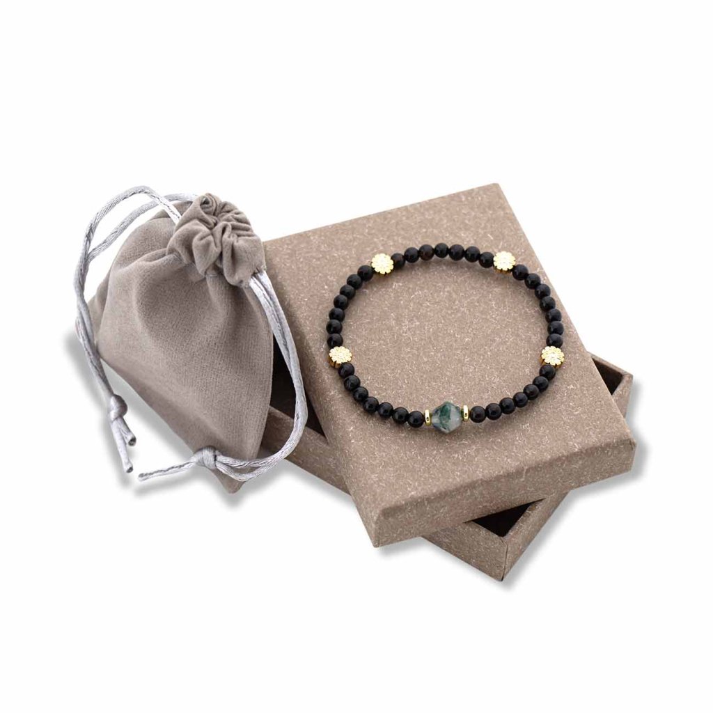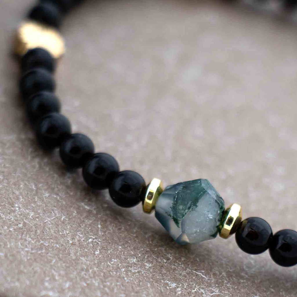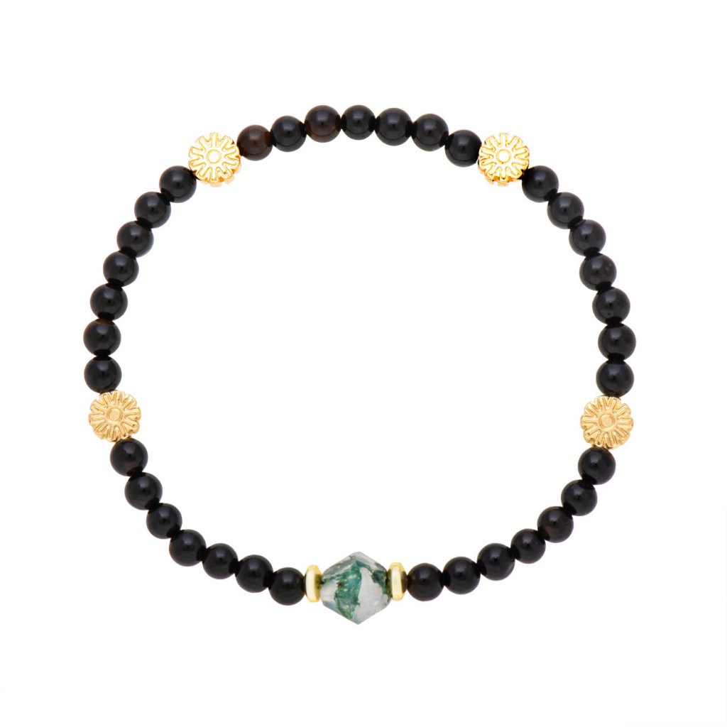 Štýlový náramok vyrobený z drobných korálikov ónyxu, ktorý dodáva šperku luxusný a zároveň nadčasový vzhľad. Stred tvorí nepravidelne brúsený kameň v náhodnej farbe od svetlej po tmavú v kombinácii s kovovými komponentmi z chirurgickej ocele v zlatej farbe. Vďaka pružnej gumičke sa náramok ľahko prispôsobí zápästiu a je veľmi pohodlný na každodenné nosenie.