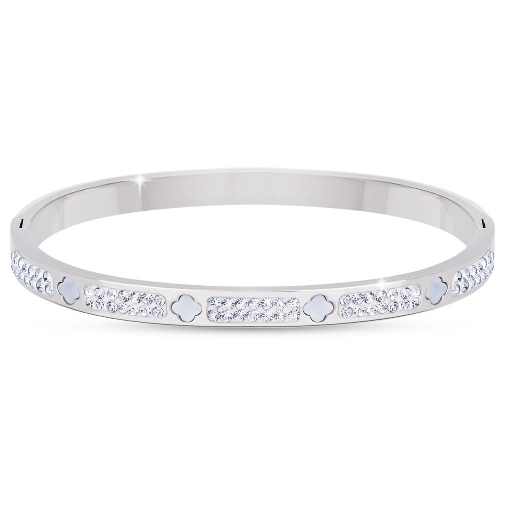 Pevný náramok zdobený žiarivými čírymi kryštálmi a jemnými symbolmi štvorlístkov v perleťovom prevedení pôsobí elegantne a sofistikovane. Je ideálnou voľbou pre ženy, ktoré hľadajú decentný, ale pritom pútavý doplnok na každodenné nosenie aj slávnostné chvíle.