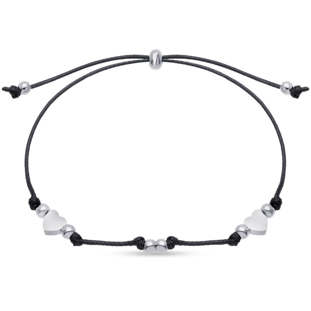 Minimalistický náramok na čiernej šnúrke s dvoma jemnými srdiečkami z chirurgickej ocele symbolizuje spojenie, priateľstvo alebo lásku. Nastaviteľná dĺžka vďaka posuvnému uzlíku zaisťuje pohodlné nosenie pre každé zápästie. Vďaka kombinácii pevnej textílie a odolného kovu je náramok ideálny aj na každodenné nosenie.