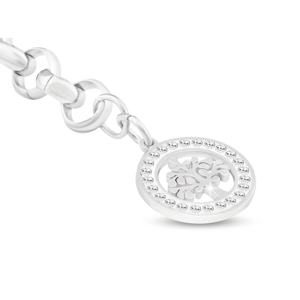Výrazný náramok s lesklými článkami, doplnený okrúhlym príveskom s motívom Stromu života, ktorý symbolizuje rovnováhu, harmóniu a silu. Elegantné spracovanie v kombinácii s jemnými zirkónmi vytvára šperk, ktorý zaujme na prvý pohľad. Ideálny pre tých, ktorí hľadajú spojenie významu a štýlu v každodennom nosení.