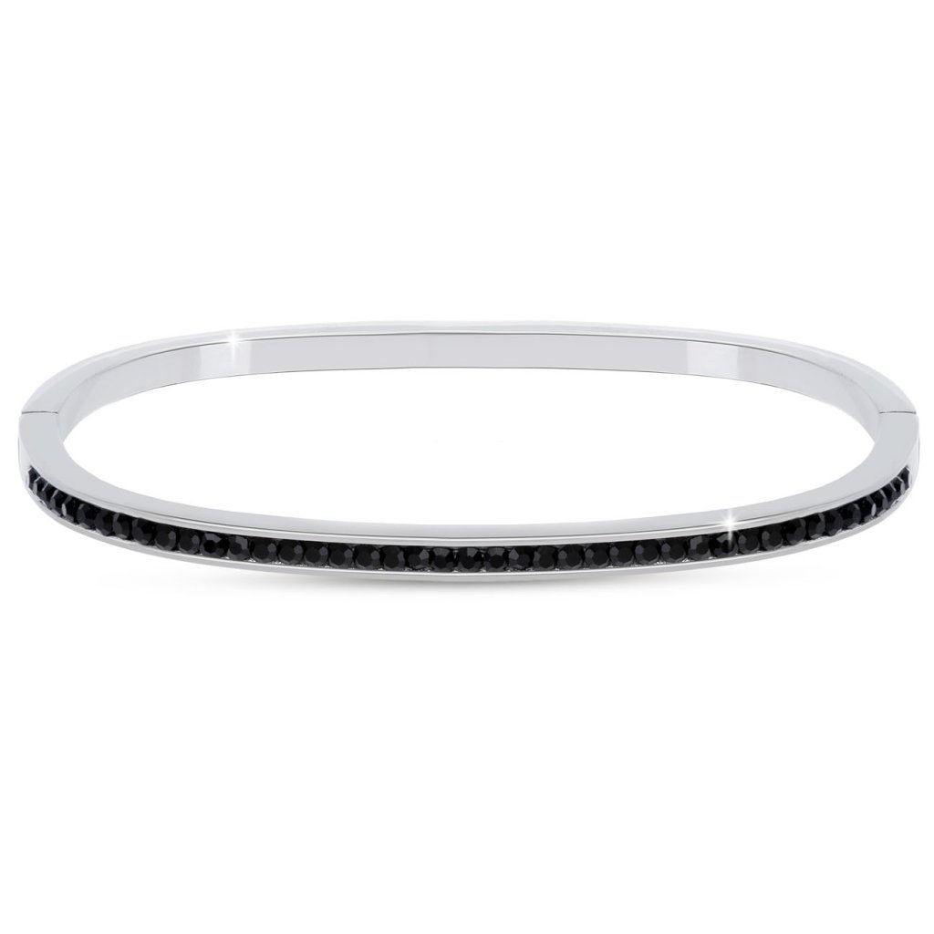 Pevný náramok z chirurgickej ocele a jedna polovica náramku je zdobená čiernymi zirkónmi.