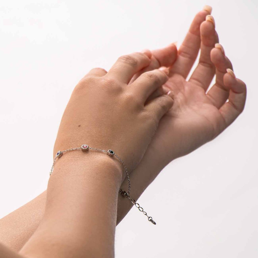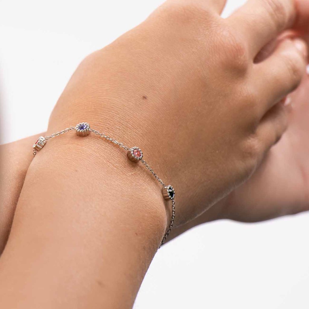 Jemný a elegantný náramok s drobnými farebnými zirkónmi na tenkom kovovom lanku je ideálnym doplnkom pre každodenné nosenie aj slávnostné príležitosti. Každý zirkón má svoju vlastnú farbu a lesk, čo z náramku robí originálny šperk plný hravosti a jemnosti.