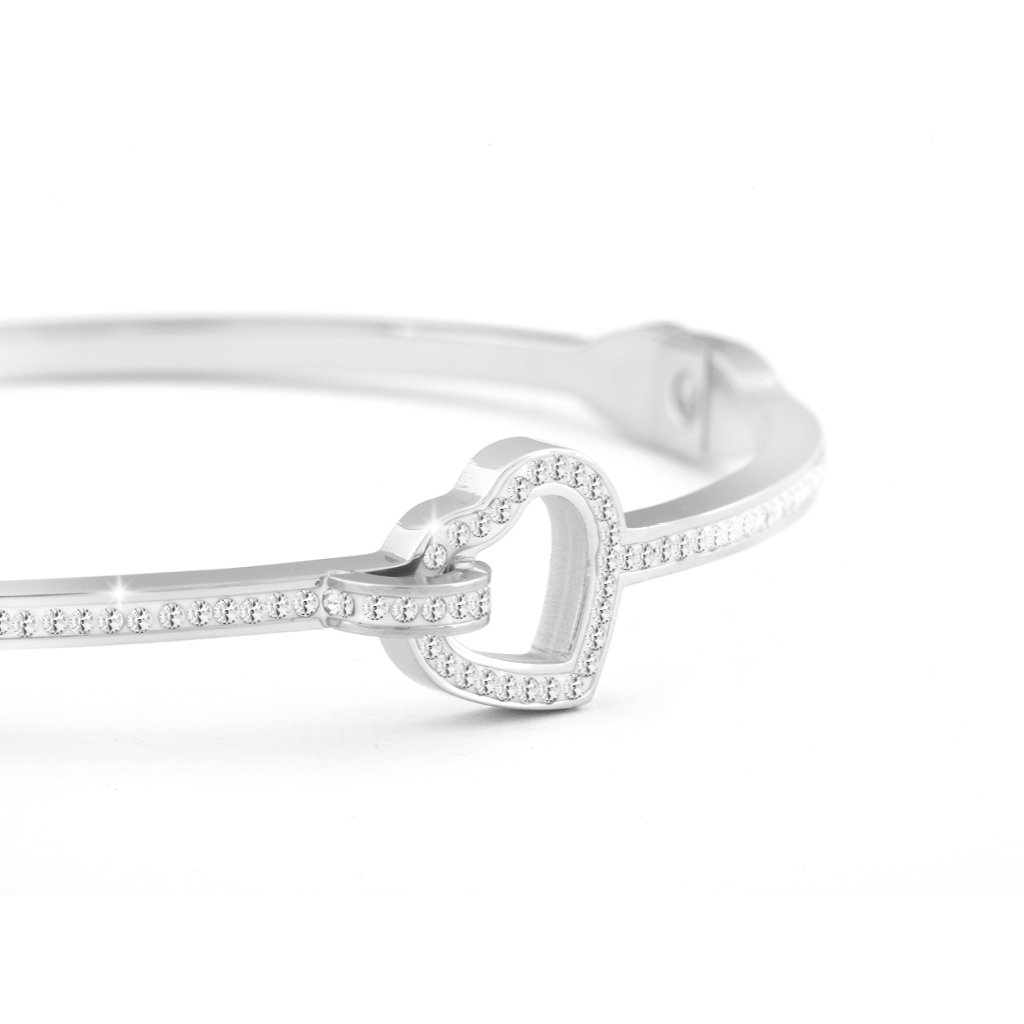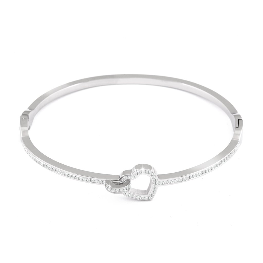 Elegantný a minimalistický náramok s motívom dvoch prepojených sŕdc predstavuje symbol lásky, spojenia a harmónie. Jemne zasadené trblietavé kryštáliky na obvode dodávajú šperku decentný lesk, ktorý zaujme pri každej príležitosti. Skvelý doplnok k romantickým aj každodenným outfitom.