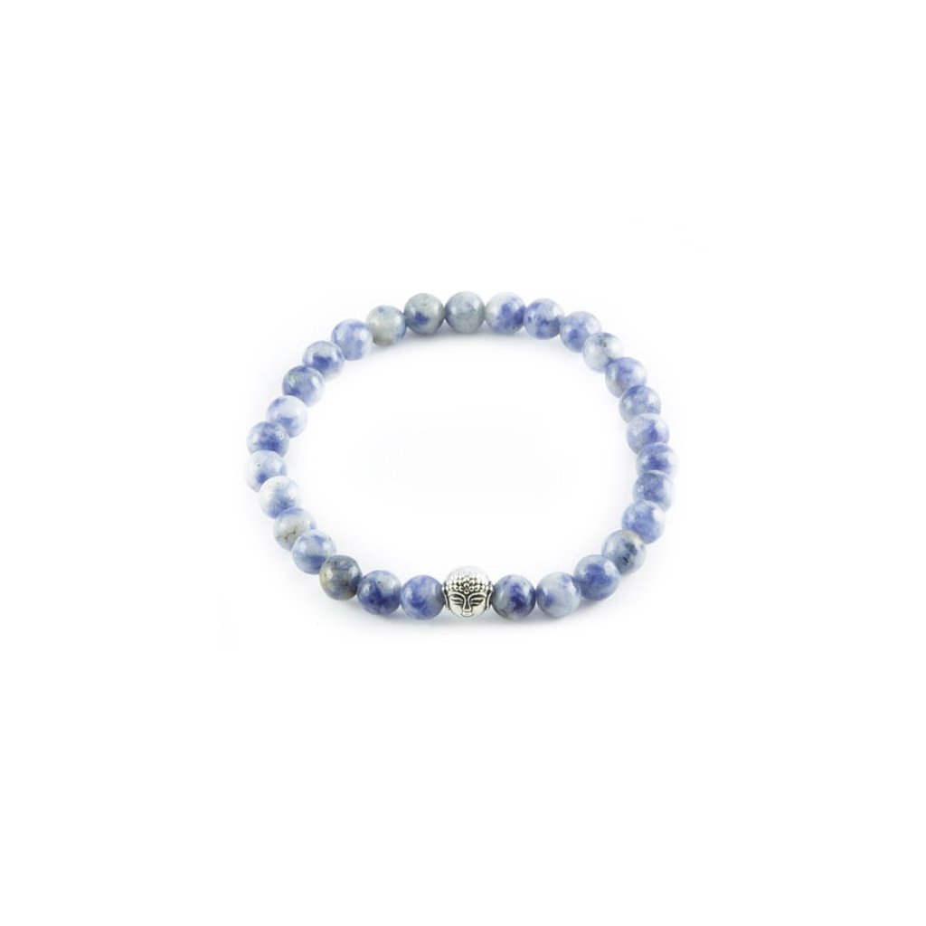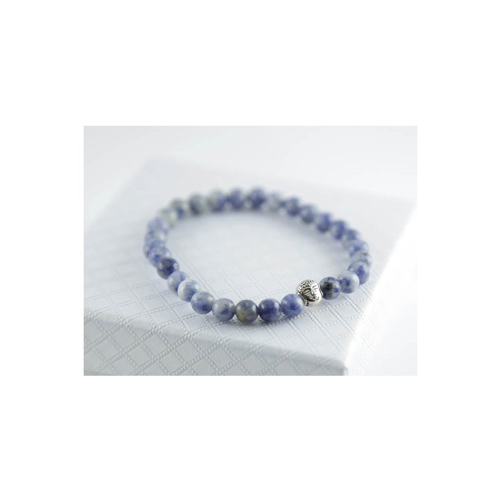 Elegantný náramok zložený z korálikov prírodného sodalitu, ktorý je cenený pre svoje upokojujúce modré odtiene. Sodalit je považovaný za kameň pokoja, harmónie a intuície, podporuje vyrovnanosť a pomáha uvoľniť stres. Dominantným prvkom náramku je kovový korálik s hlavou Budhu, ktorý symbolizuje duchovnú silu a vnútornú rovnováhu. Elastické prevedenie zaisťuje pohodlné nosenie a jednoduché navliekanie. Tento náramok je ideálnym doplnkom pre tých, ktorí hľadajú spojenie elegancie a duchovnej symboliky.