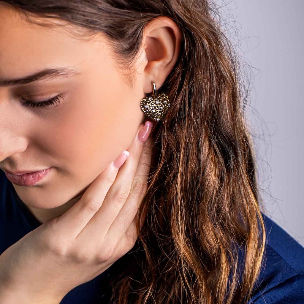 Pozlátené náušnice 14k visiace v tvare srdca prerastené vetvami vyskladané zirkónmi. Veľmi kvalitné spracovanie. Náušnice majú krásny žiarivý vzhľad, dodávajú eleganciu v každom smere.