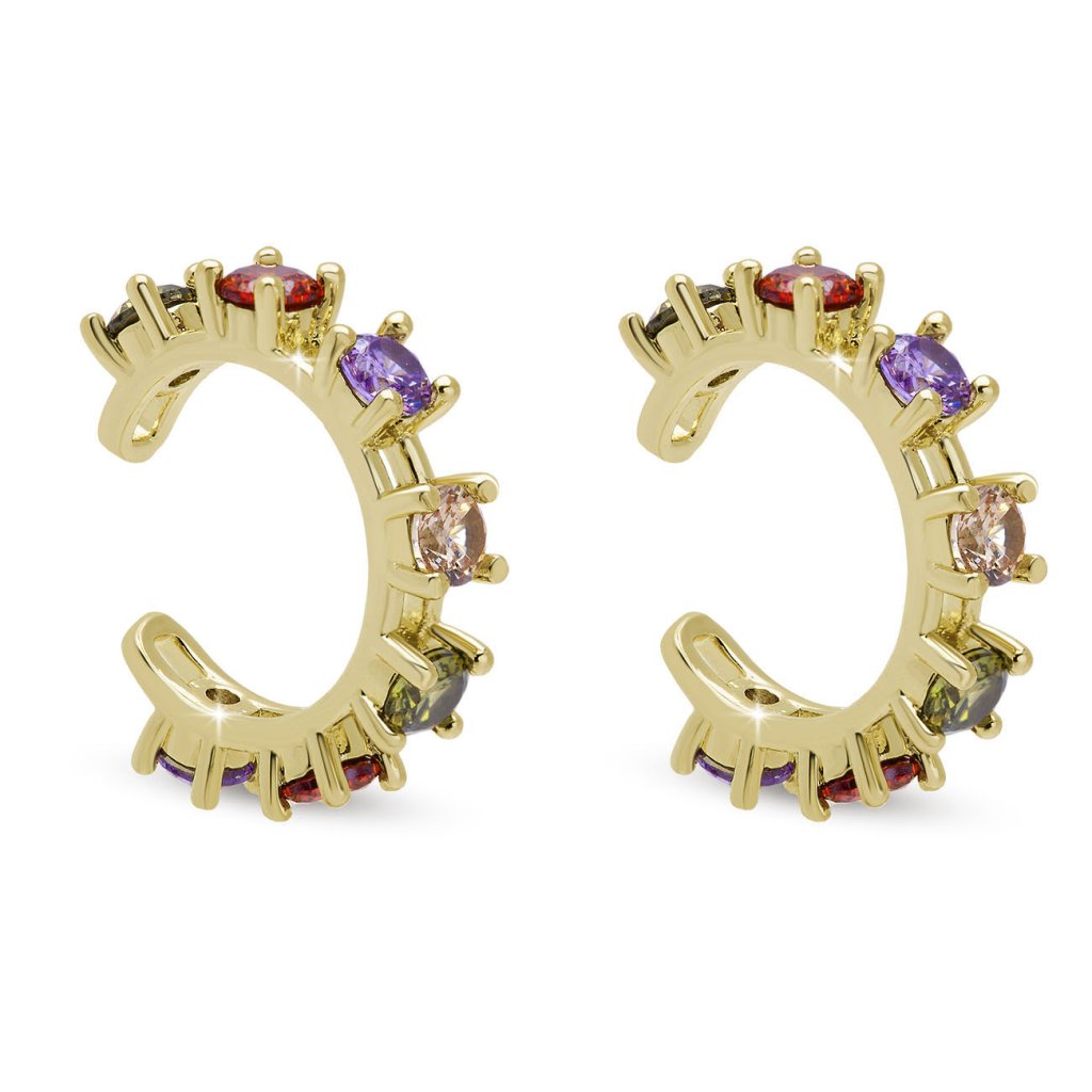 Moderné a odvážne náušnice v tvare polkruhu, ktoré zaujmú nepravidelným rozmiestnením farebných zirkónov v rôznych tvaroch a odtieňoch. Dizajn pripomína slnečné lúče alebo efektnú korunku – ideálne pre ženy, ktoré milujú originálne šperky s výrazným vzhľadom. Nasadzujú sa za ušný lalôčik a pohodlne držia aj bez prepichnutia ucha.