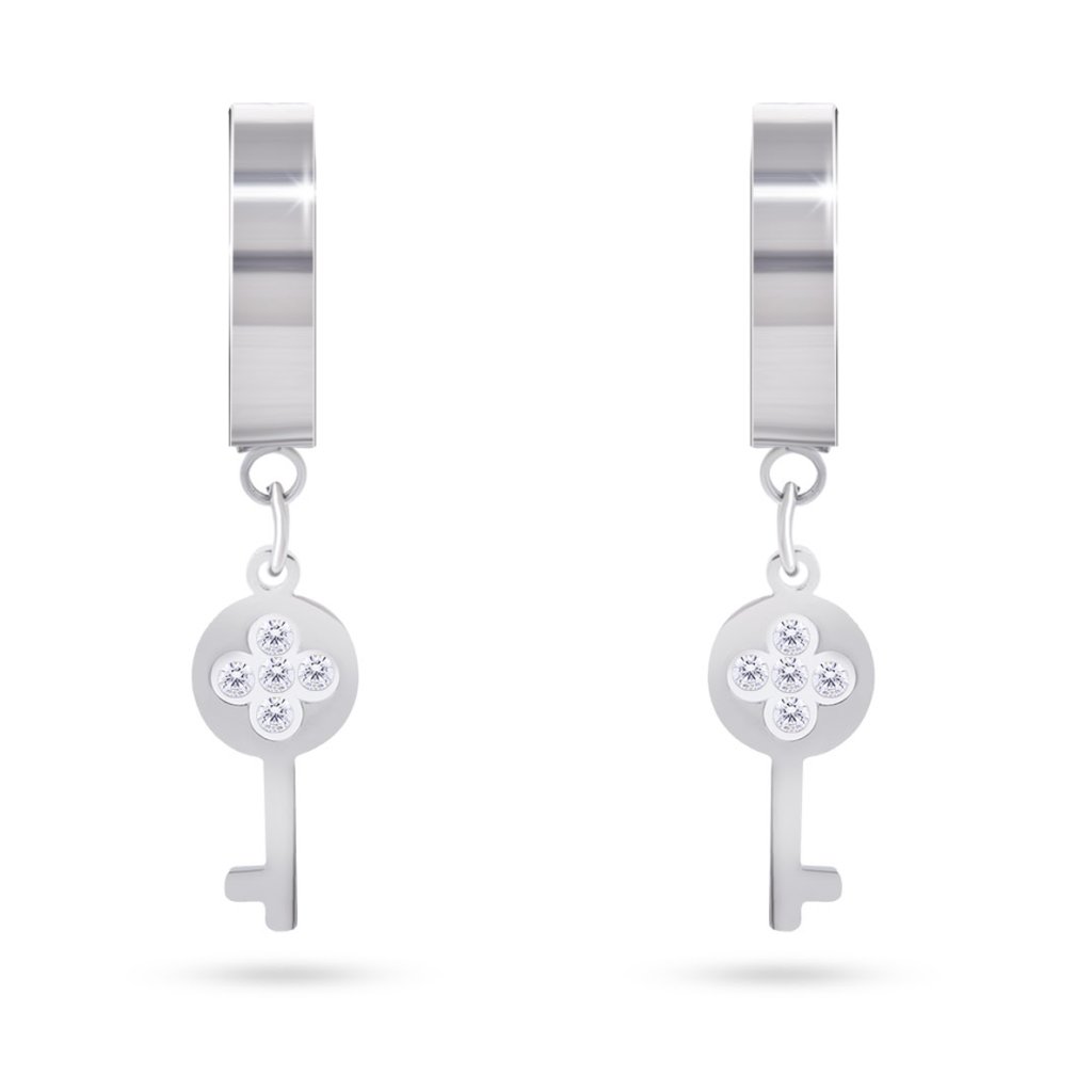 - Náušnice z chirurgickej ocele, krúžok s visiacimi klíčkami a zirkónmi.
