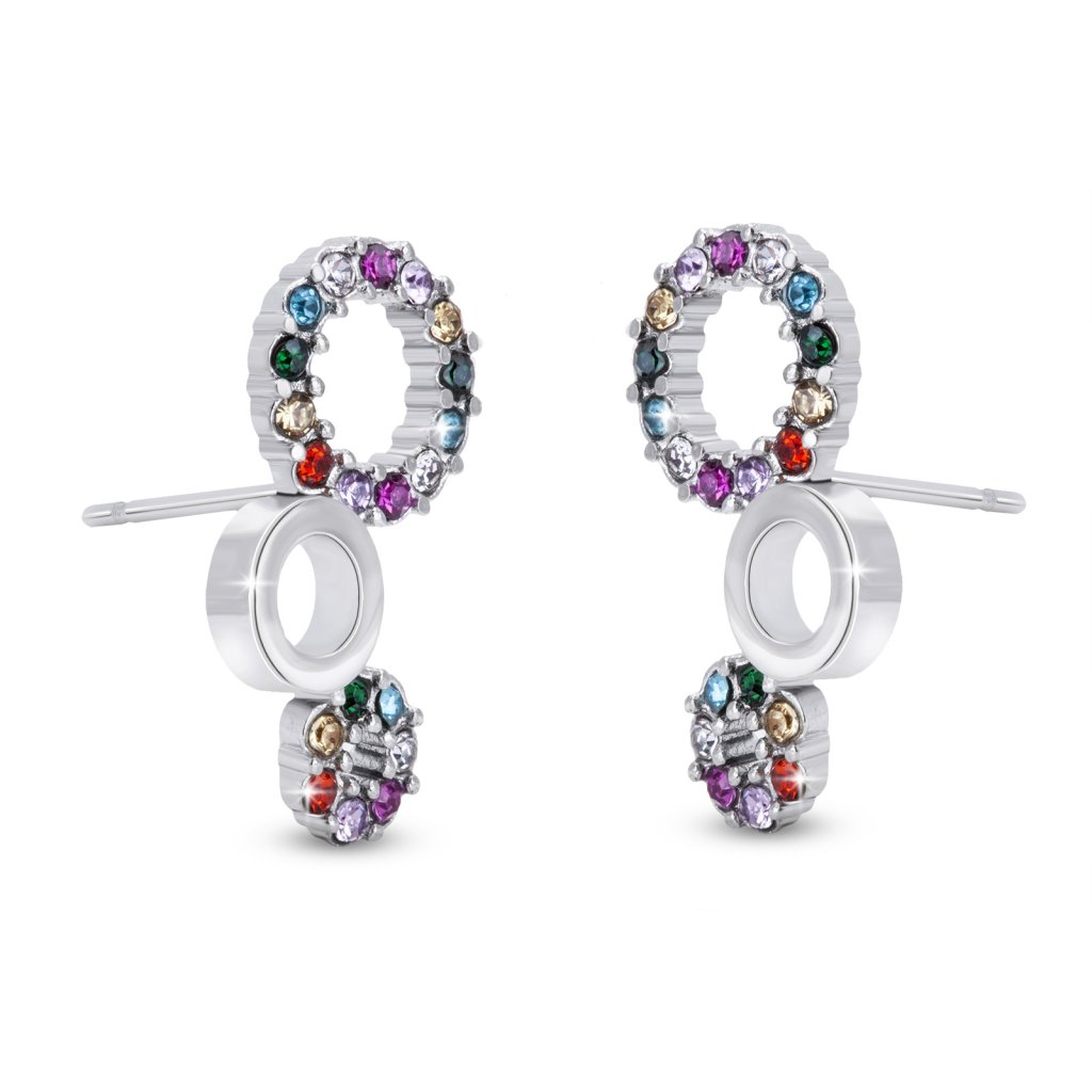 - Náušnice z chirurgickej ocele, spojené krúžky s farebnými zirkónmi.