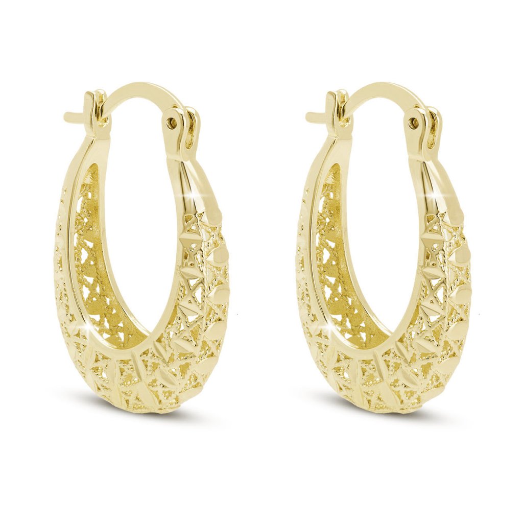 Originálne náušnice v tvare oválnych krúžkov upútajú svojím prepracovaným plastickým vzorom, ktorý vytvára jemnú hru svetla a tieňa. Vďaka zlatému lesku pôsobia elegantne a slávnostne, a napriek tomu zostávajú dostatočne decentné na každodenné nosenie. Bezpečné zapínanie zaručuje pohodlné a isté uchytenie.
